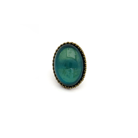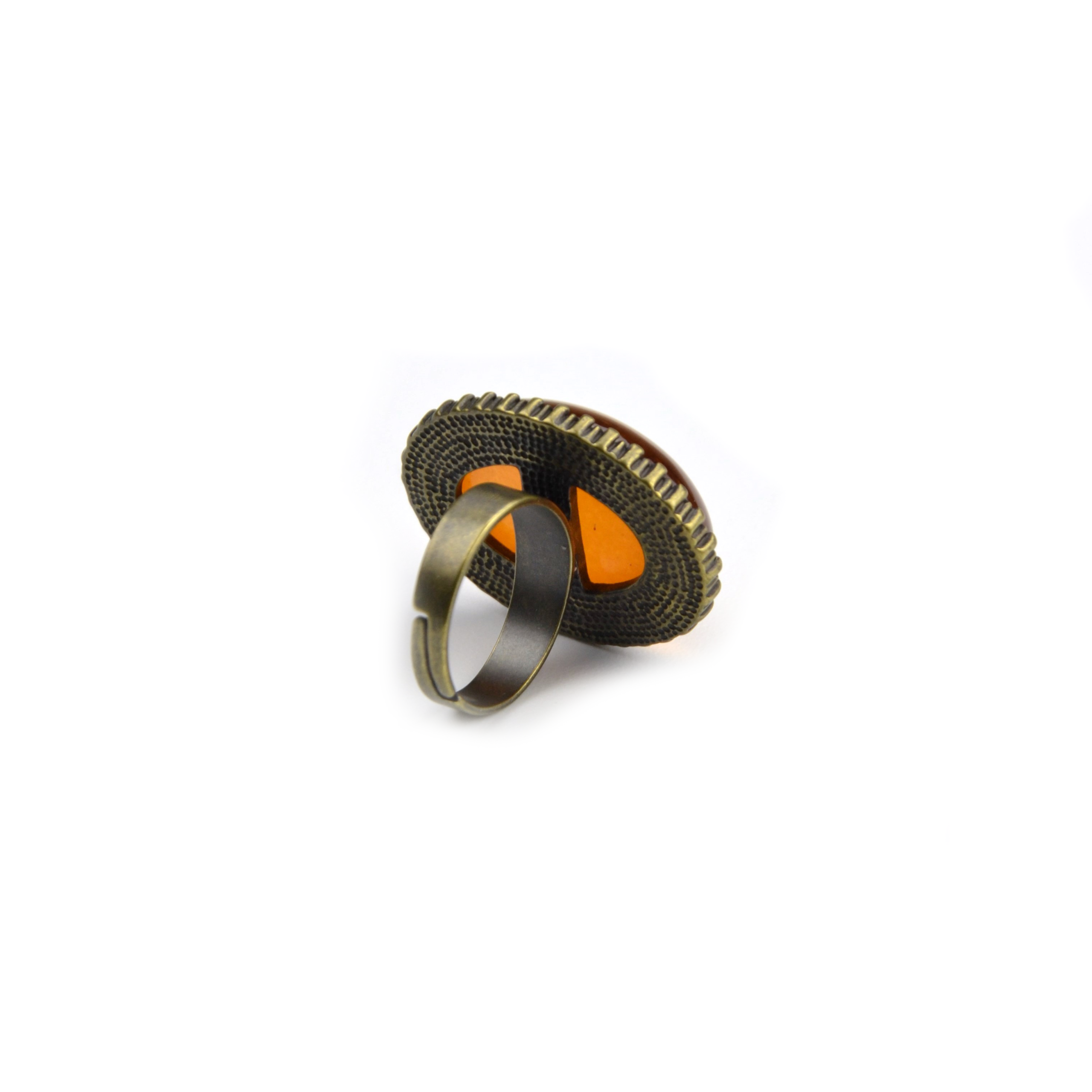 Anel “Carolina” em metal dourado velho com pedra oval em resina colorida. O anel é ajustável a vários tamanhos sendo o tamanho médio de 16.