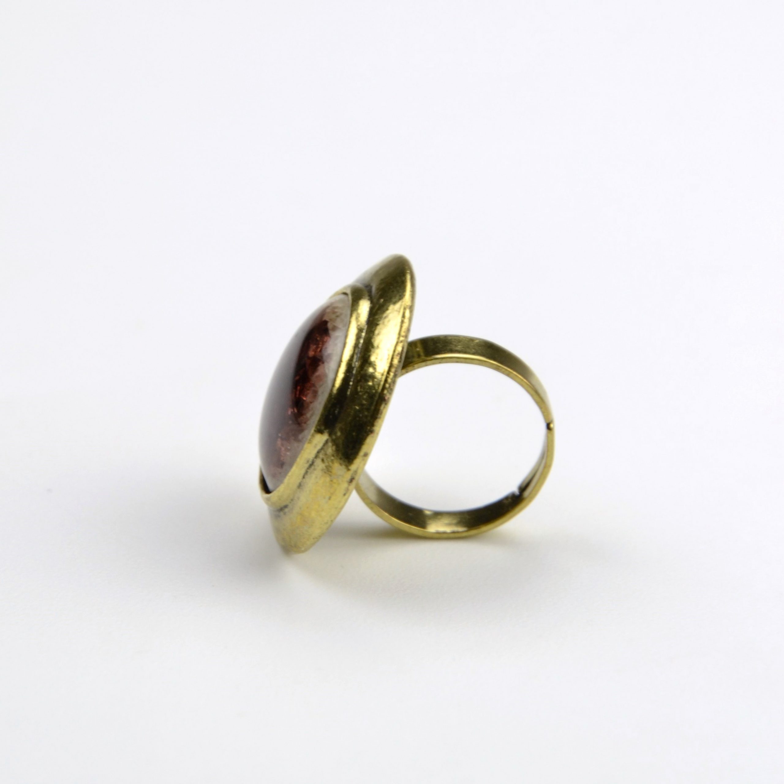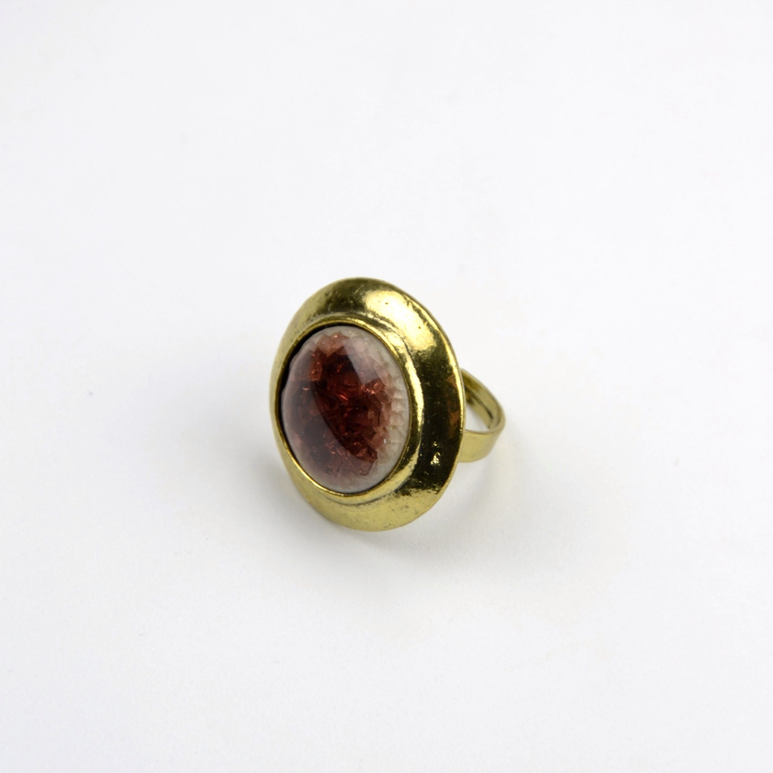 Anel em metal dourado e pedra de resina em tons de castanho e bege. O tamanho é ajustável.