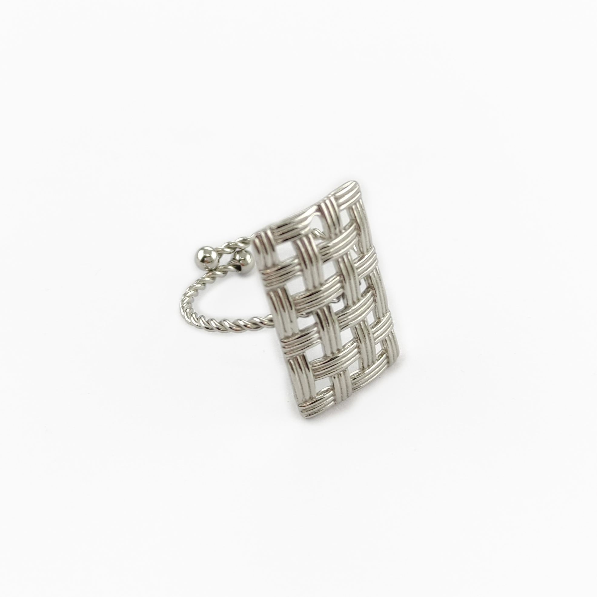 Anel retangular ajustável e trabalhado com um design entrançado.