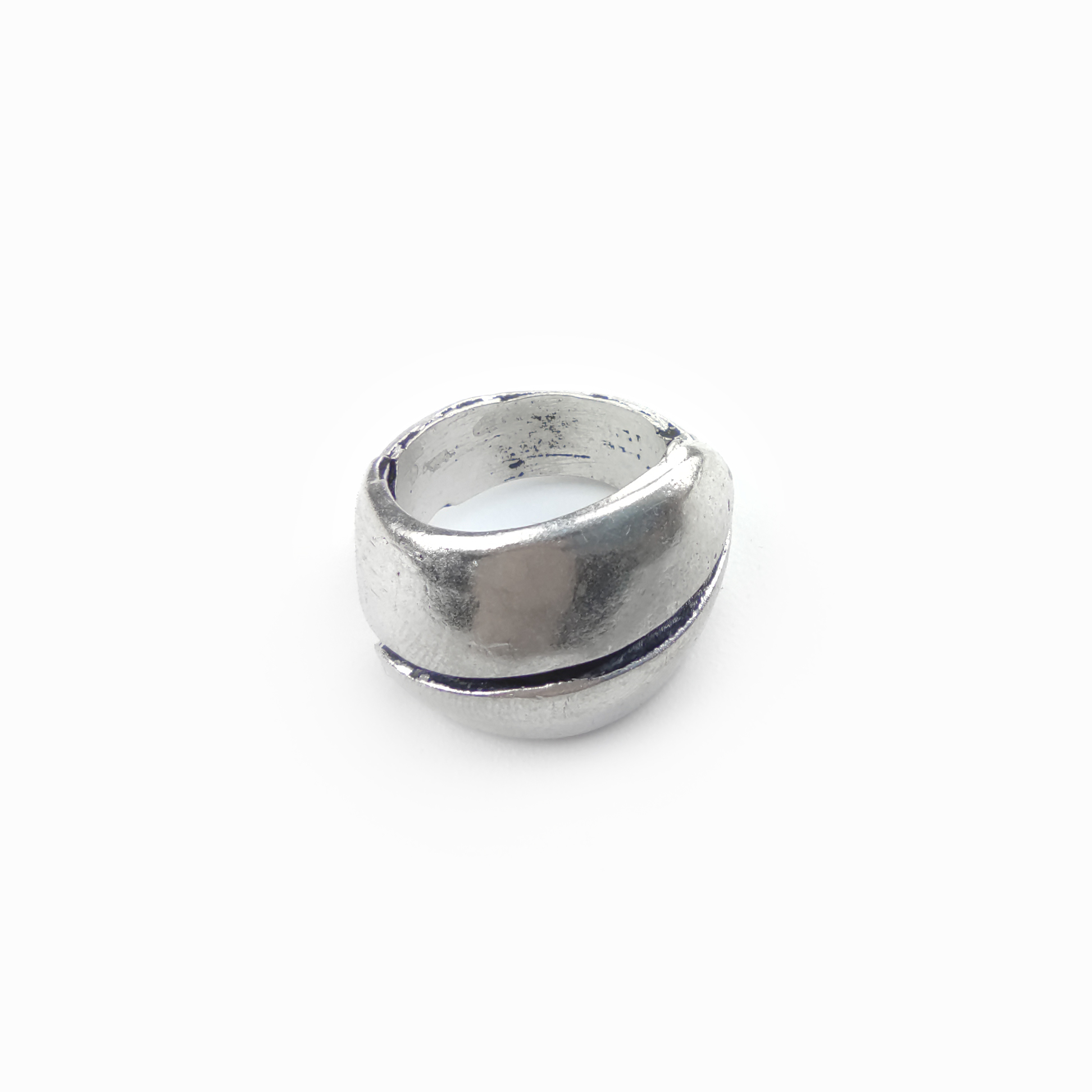 Este anel prateado apresenta um design moderno e minimalista, com linhas suaves e um corte central que cria uma divisão discreta.