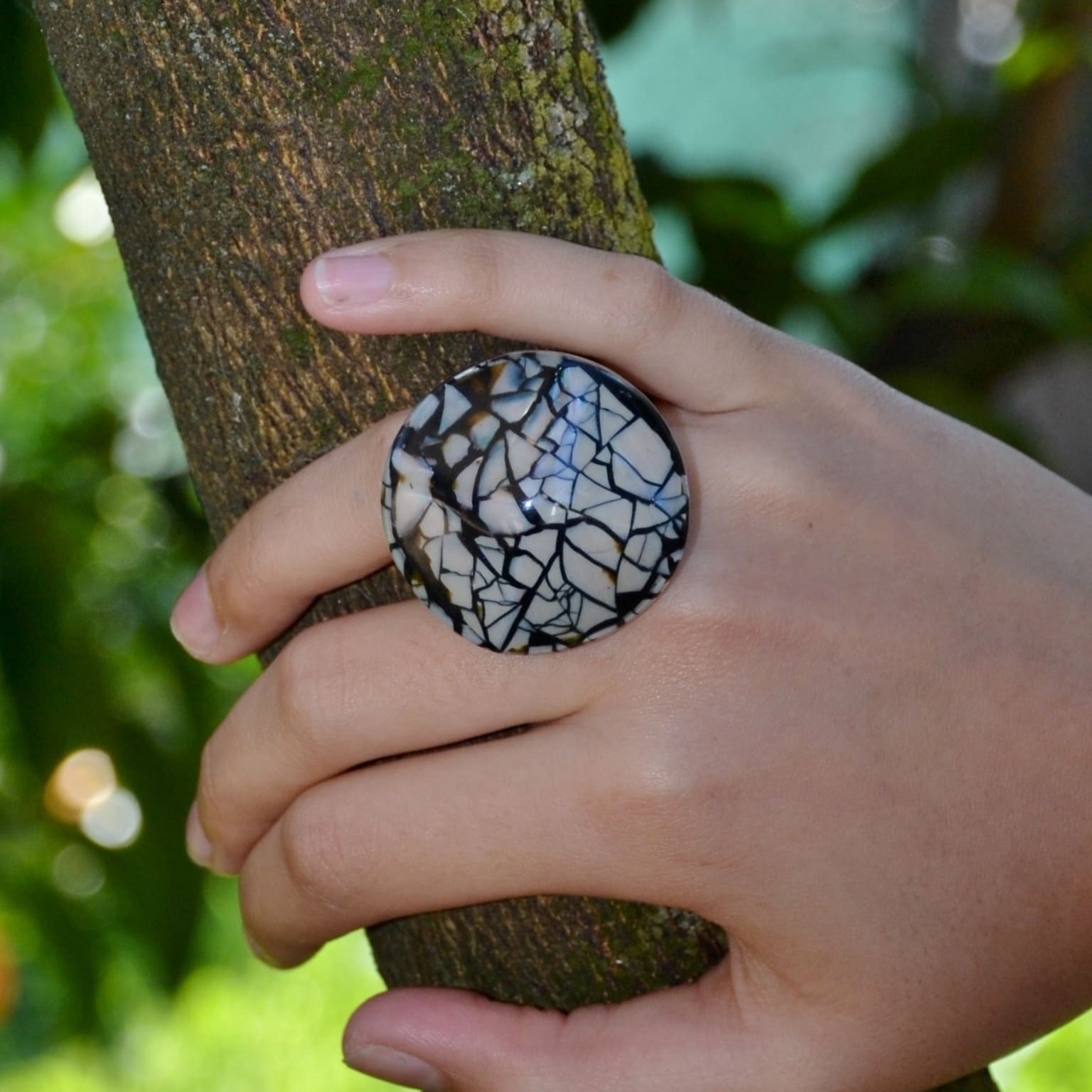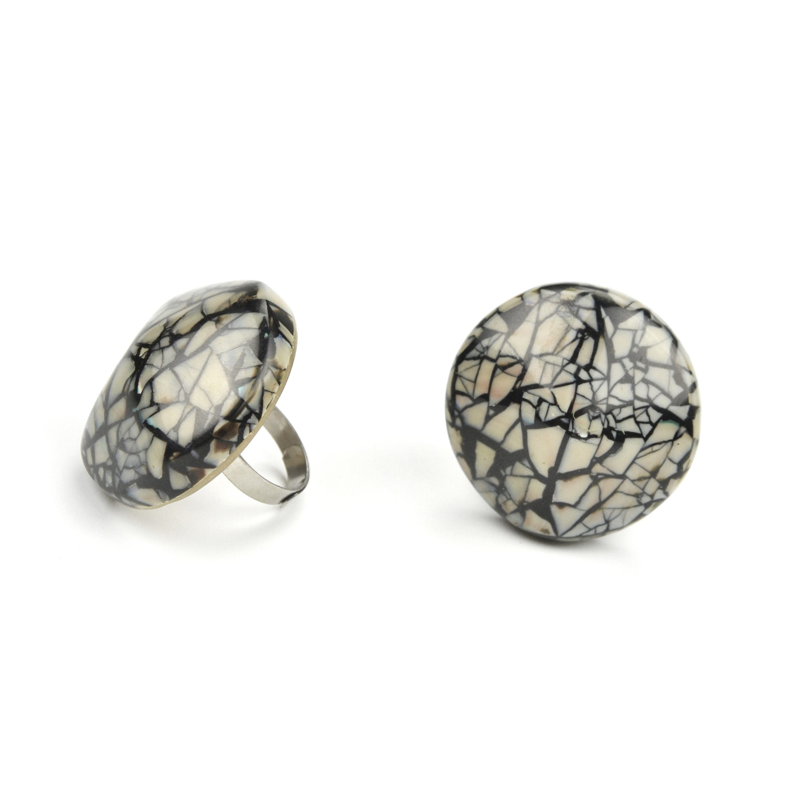 Anel ajustável com design sofisticado e padrão único em preto e creme, ideal para quem busca um acessório ousado e elegante.