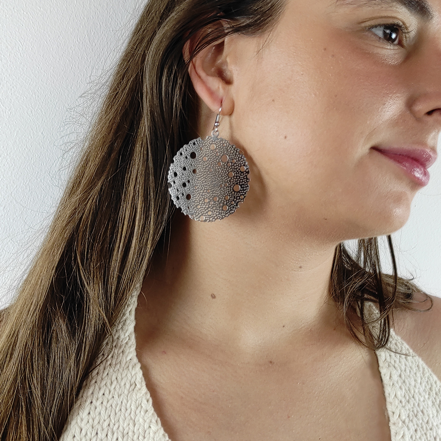 Este brinco de metal apresenta um design circular com detalhes perfurados, conferindo-lhe um estilo elegante e moderno.