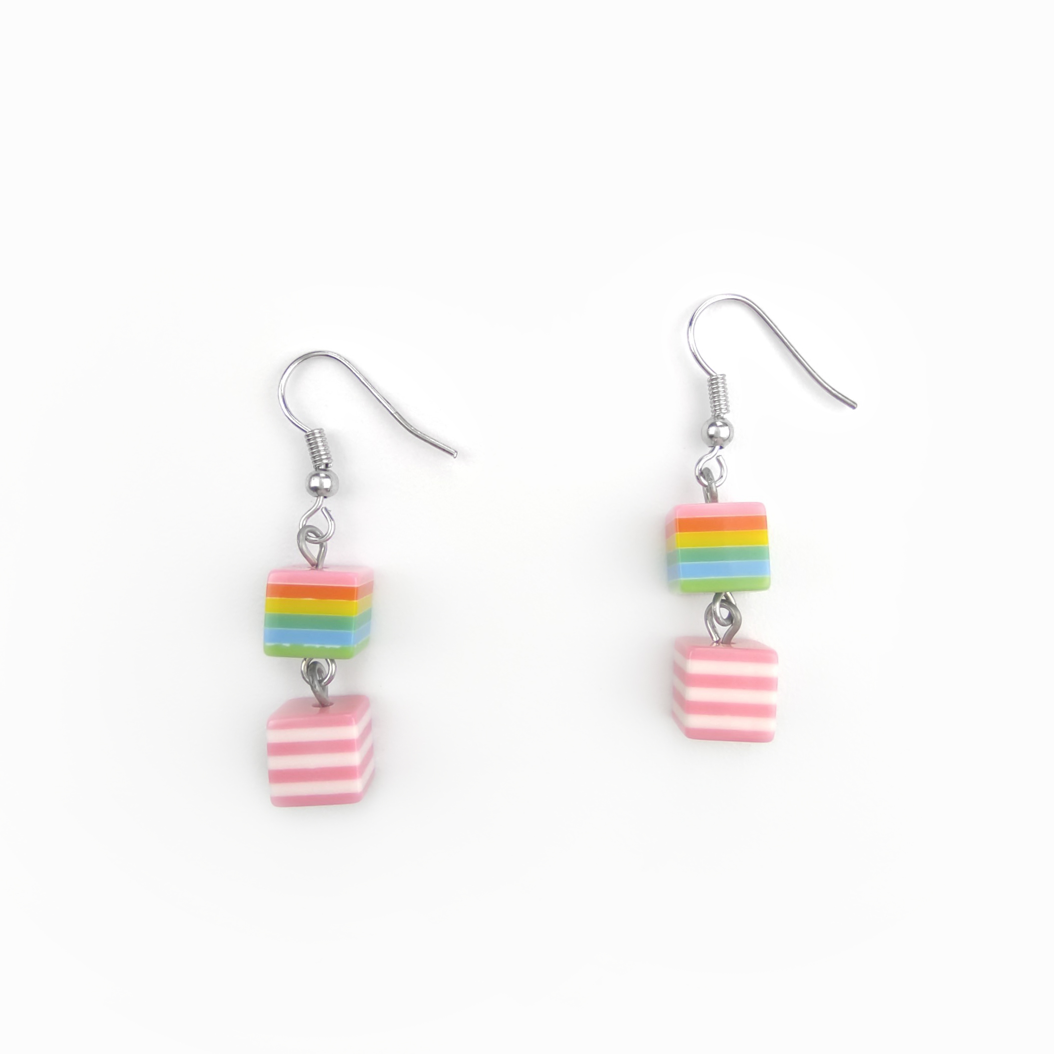 Brincos com gancho de metal prateado e pendente em forma de cubos de resina colorida.