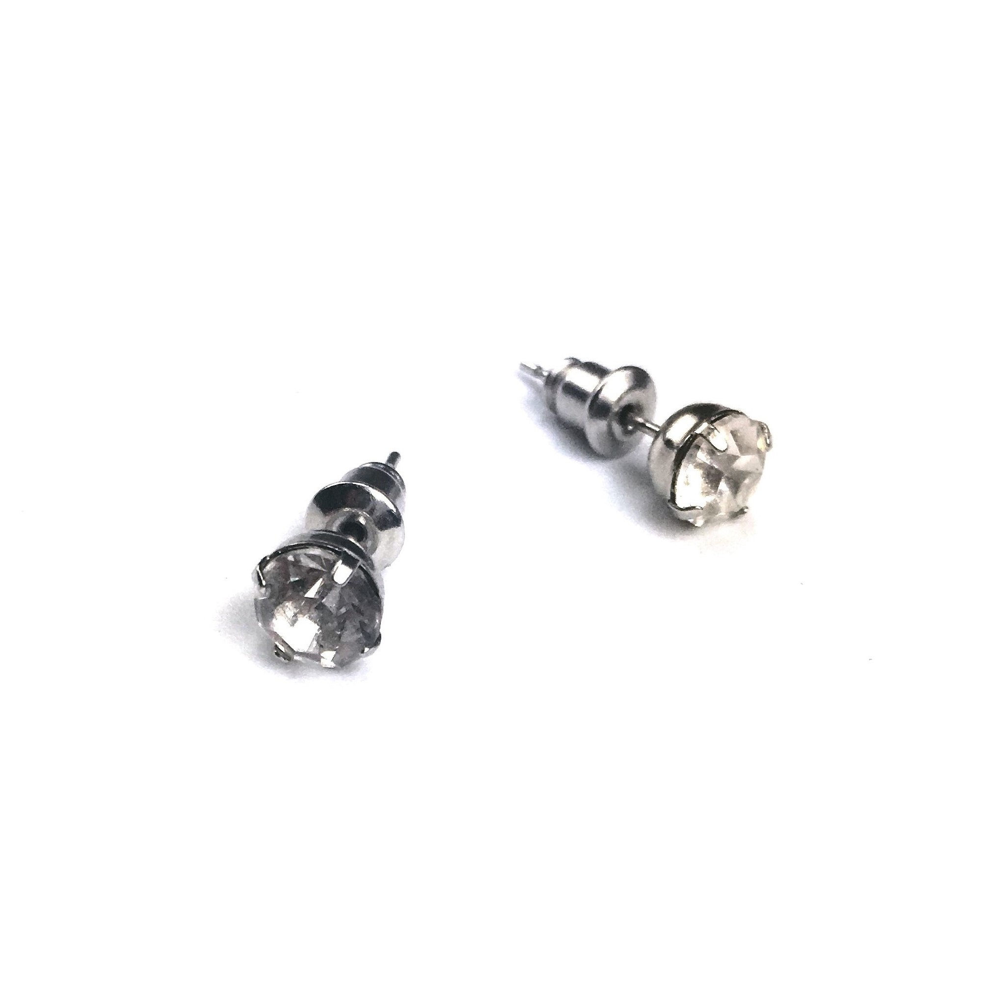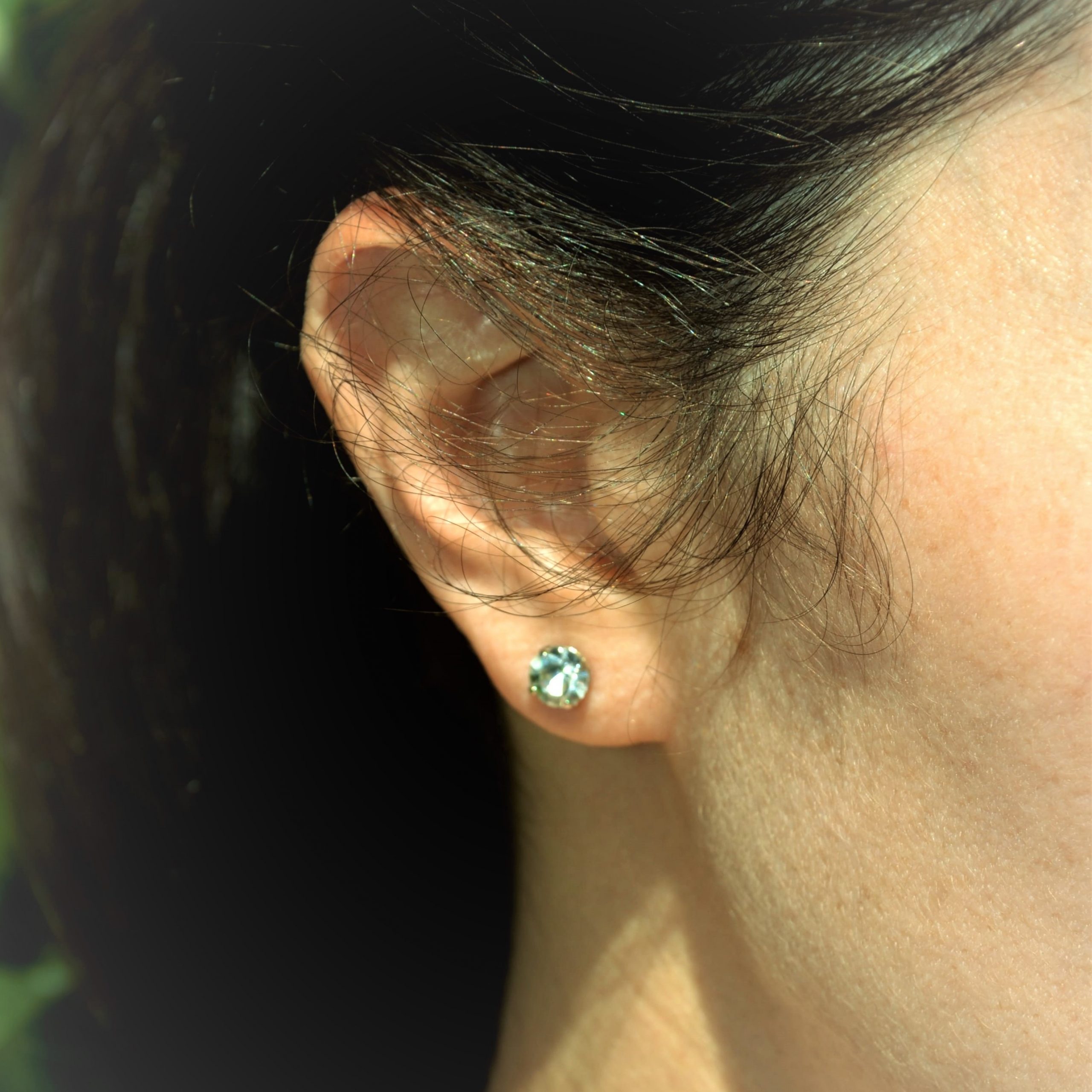 Brincos de metal prateado com pedra acrílica brilhante. Pequenos e elegantes com aperto de espec.