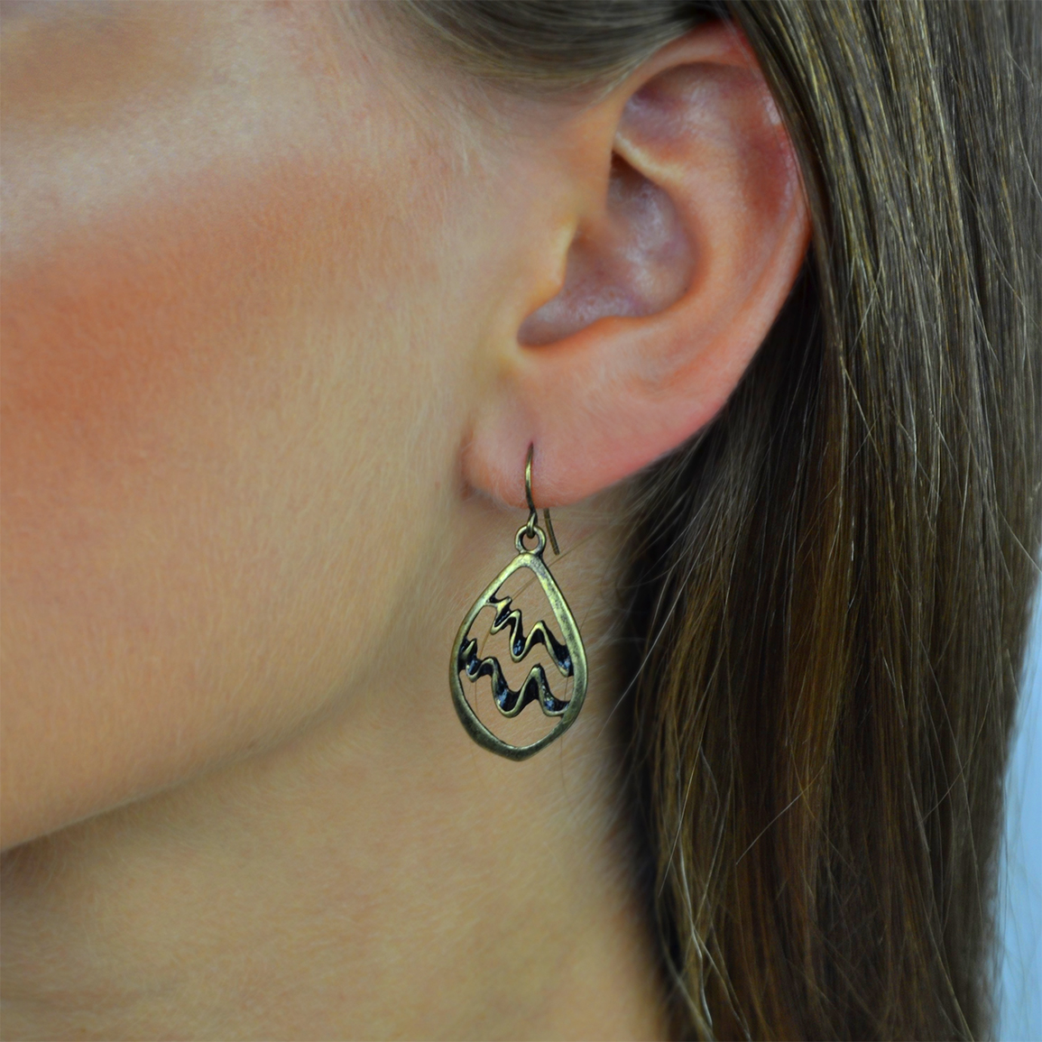 Brincos Onda Vintage. Brincos em metal dourado velho em forma de gota com ondas no interior. Possui fecho de gancho metálico.