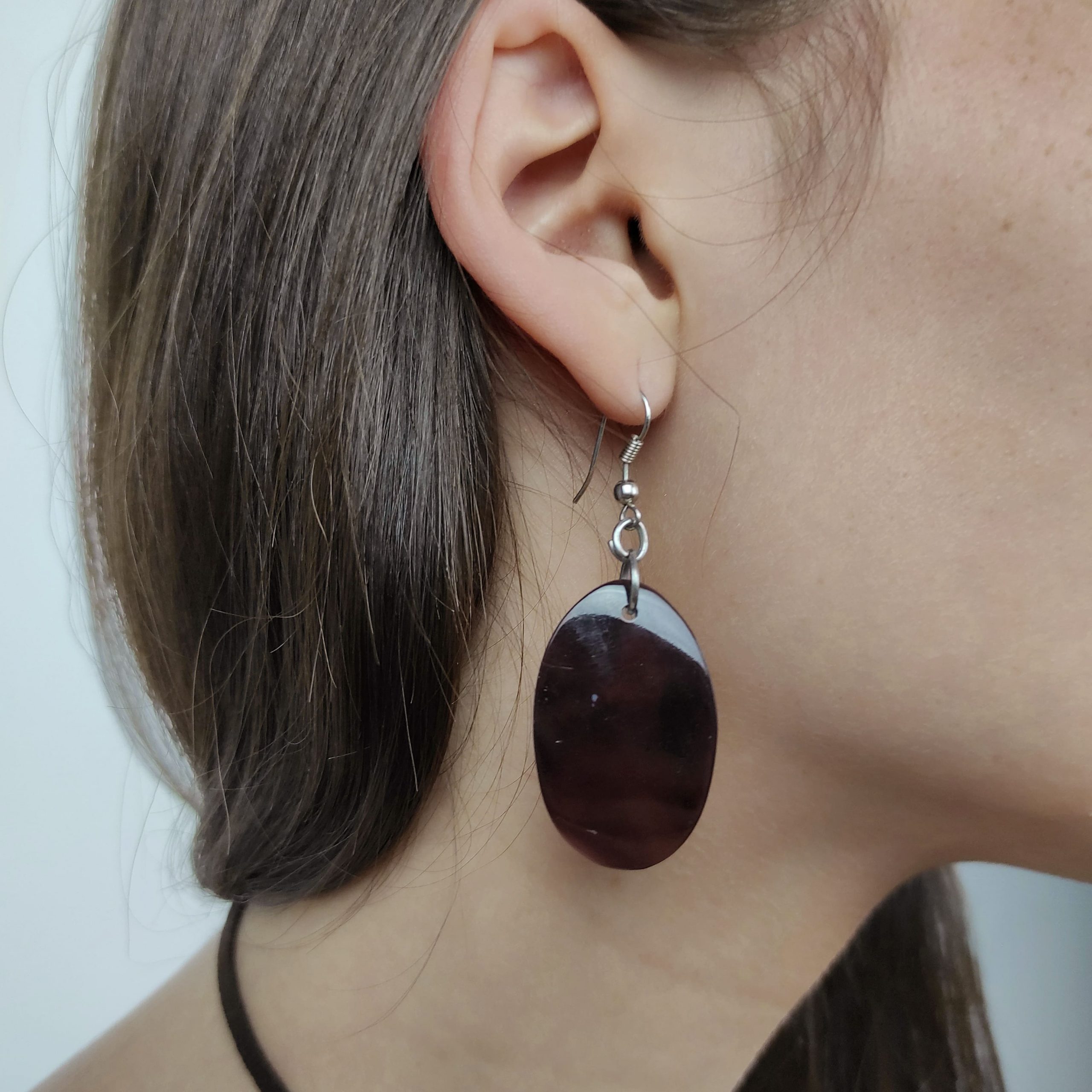 Brincos com gancho de metal prateado e pendente oval de nácar.