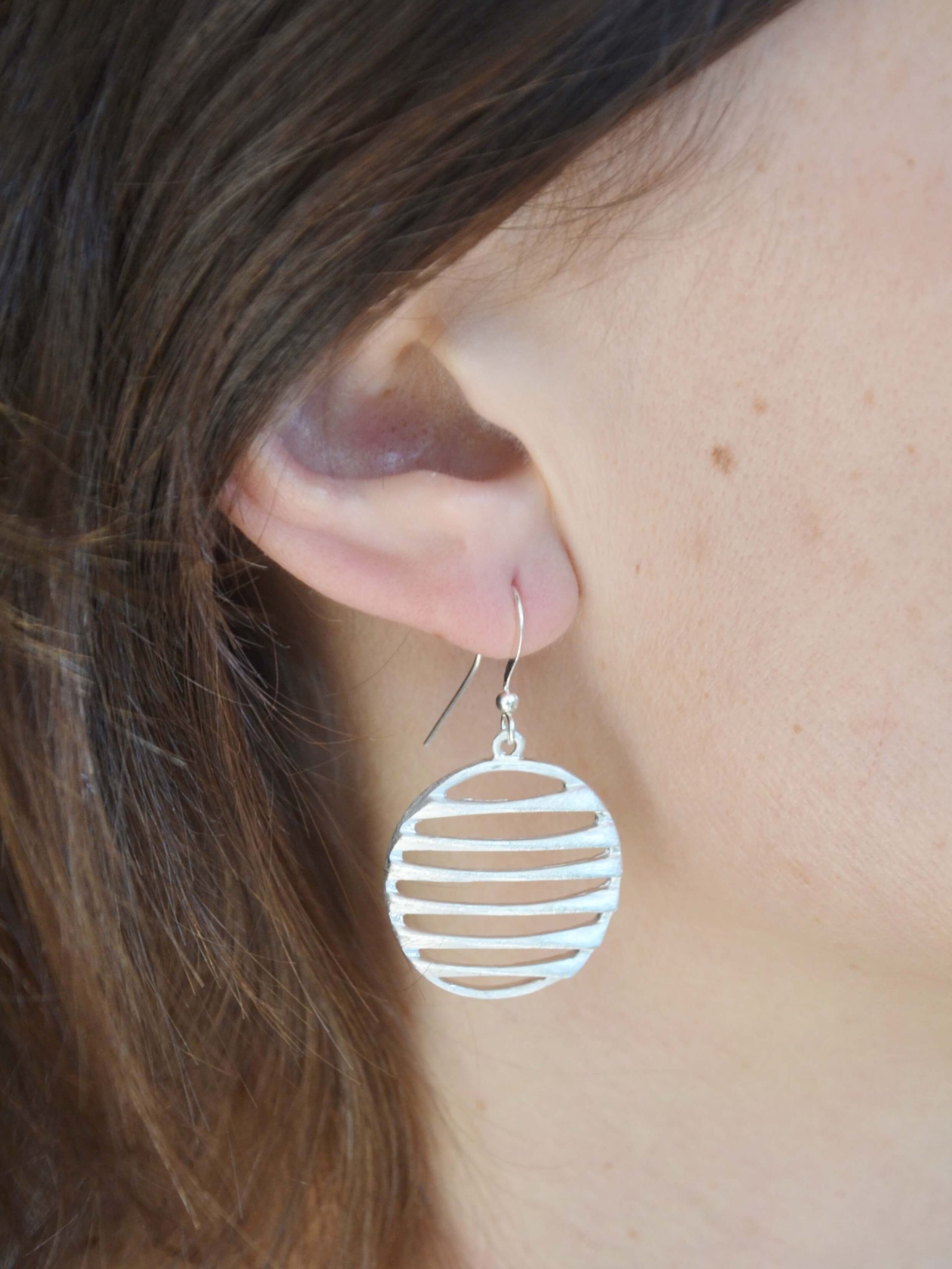Brincos estilo pequeno e redondo em zinco riscado de tom prateado. Listras horizontais no interior.