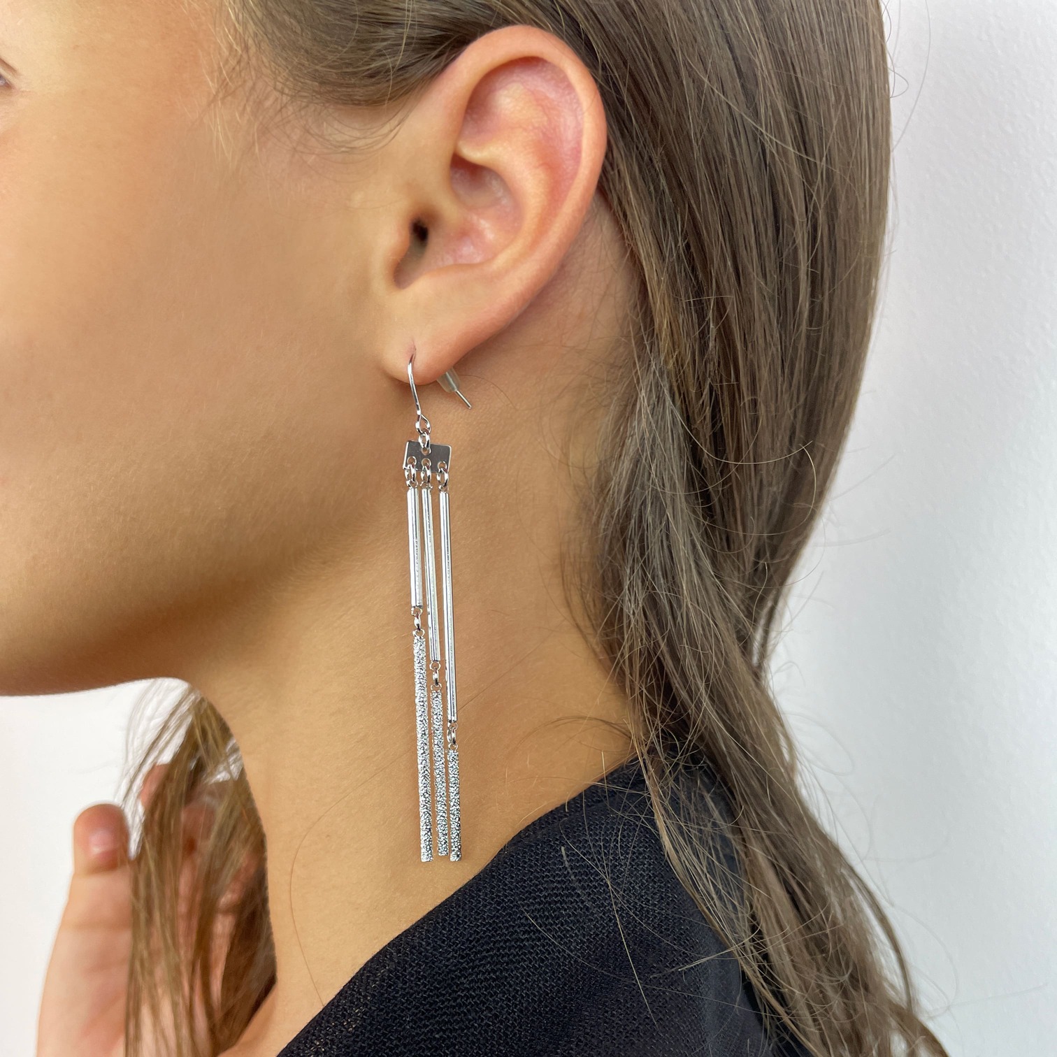 Brincos elegantes compostos por 6 tubos prateados finos lisos e foscos.
