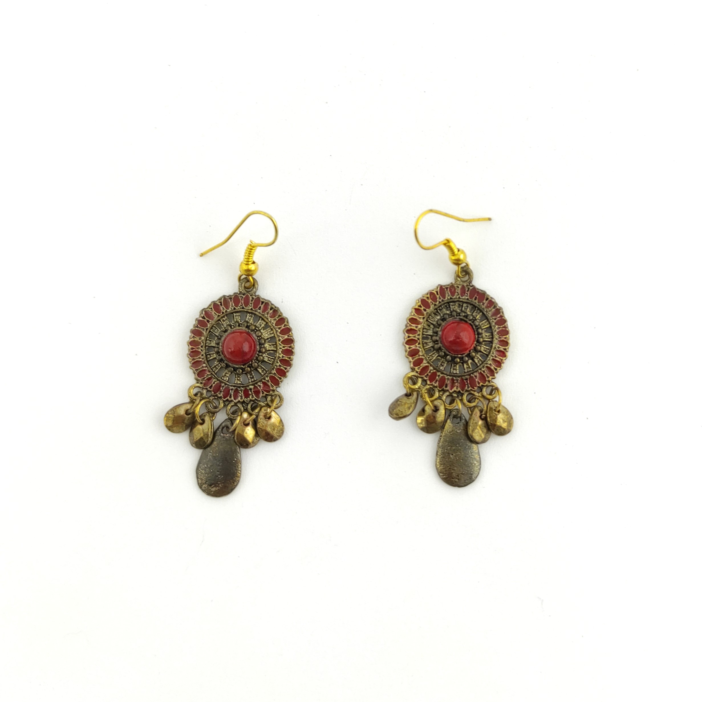 Os brincos são do tipo pendente ou gancho de orelha (ear hook), com um design intrincado e ornamentado.