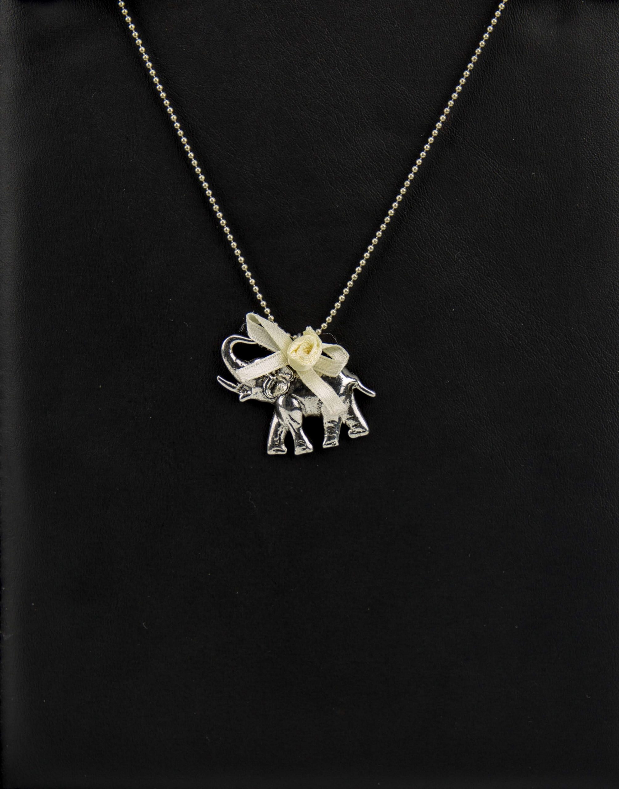 Corrente de metal com figura de elefante. Possui pequeno laço em tecido que pode também ser removido proporcionando um look mais simples.