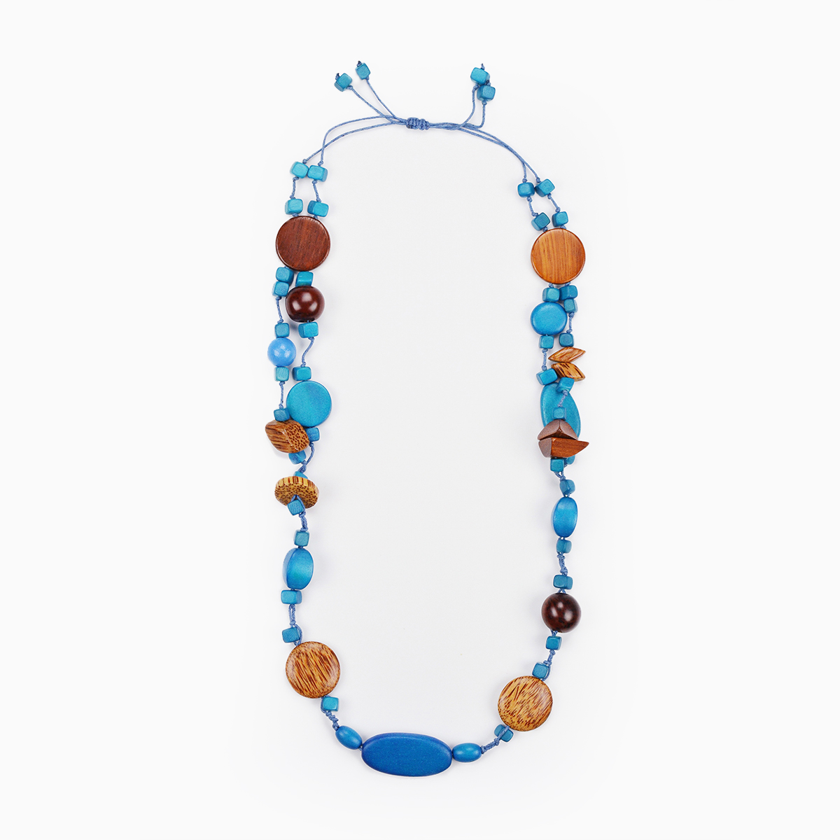 Com um design ajustável, o colar é composto por uma seleção cuidada de contas em madeira de diferentes formas e acabamentos, intercaladas com contas em azul vibrante, criando um visual orgânico e ao mesmo tempo contemporâneo.