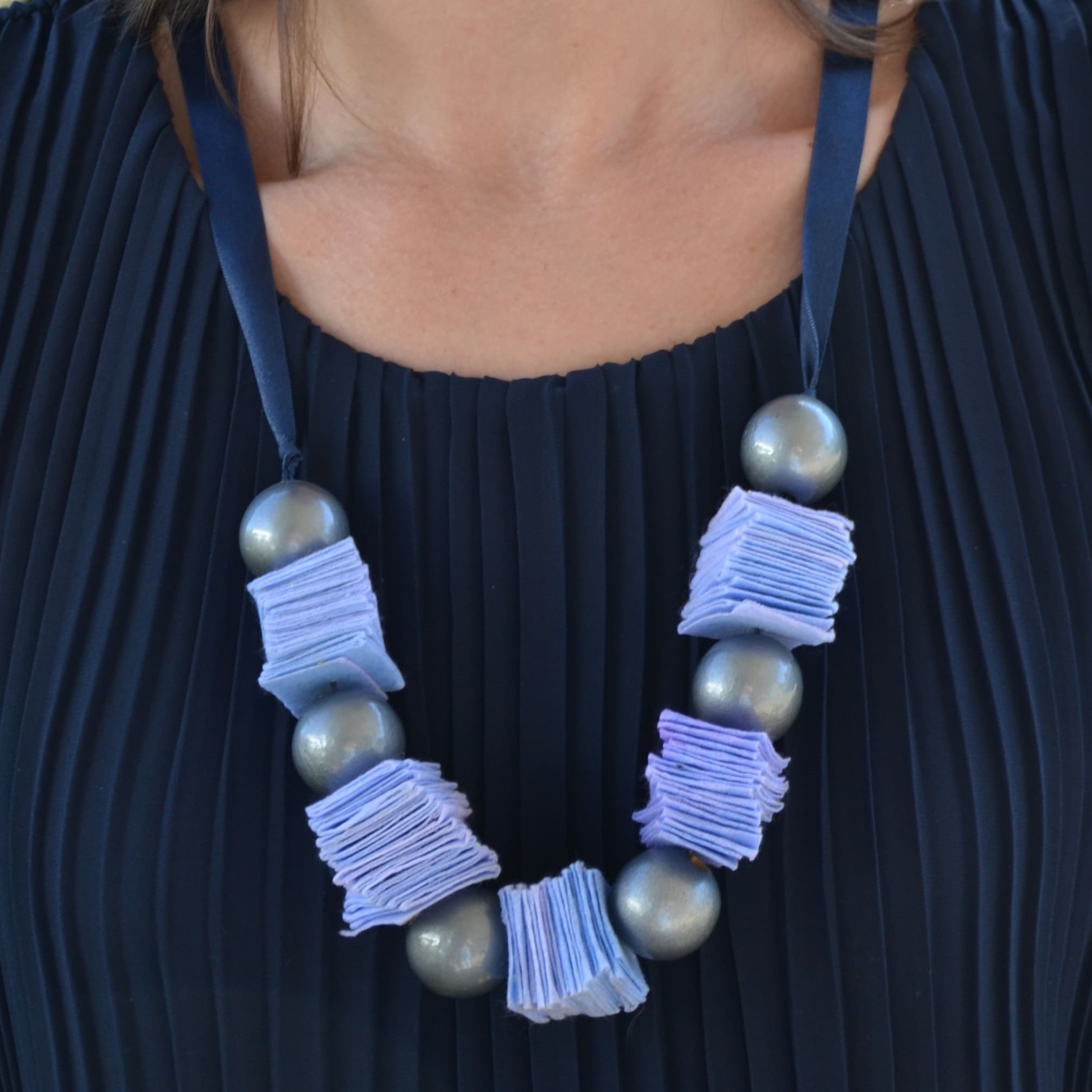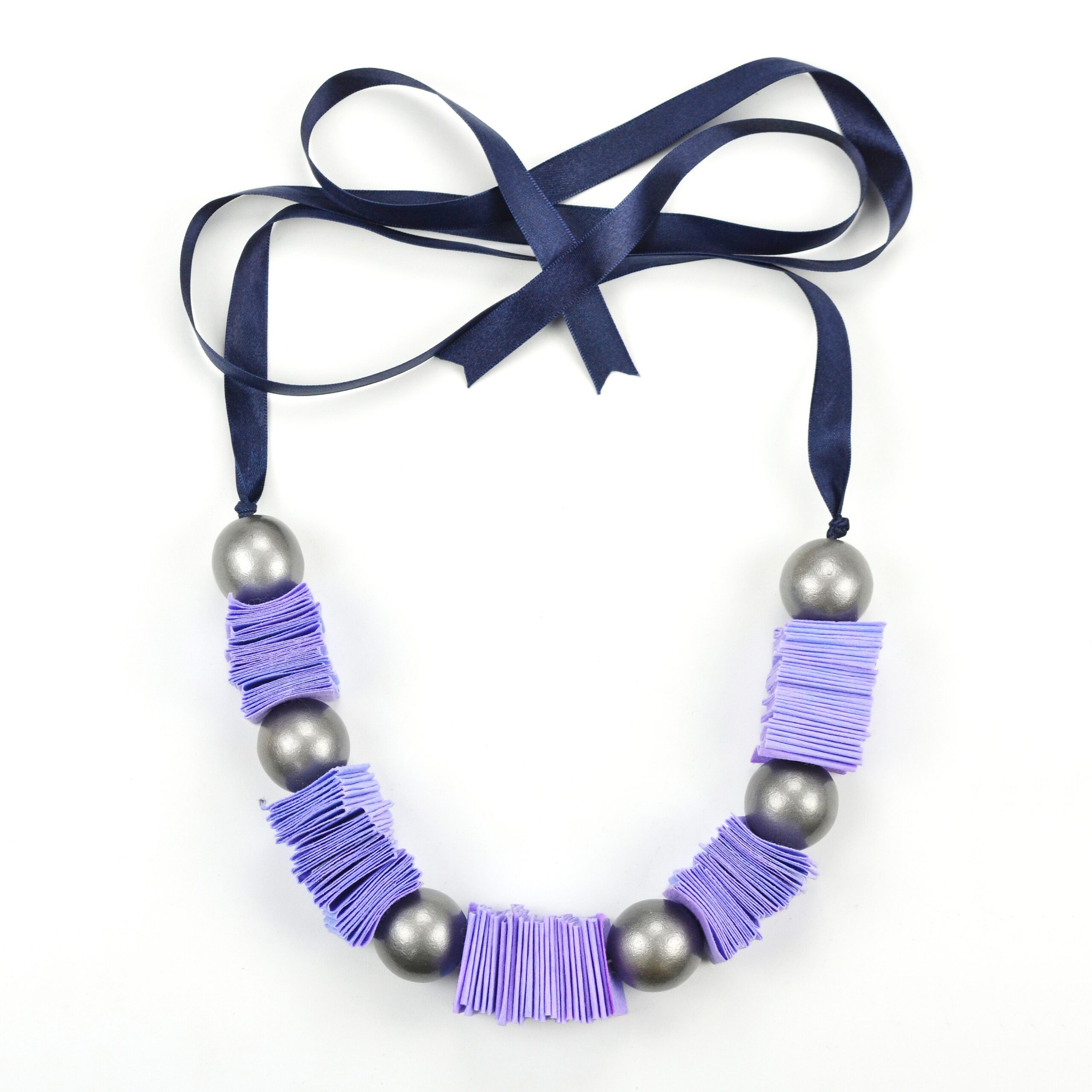 Este colar elegante combina o brilho sofisticado das contas de madeira pintadas com a textura vibrante das fitas roxas.
