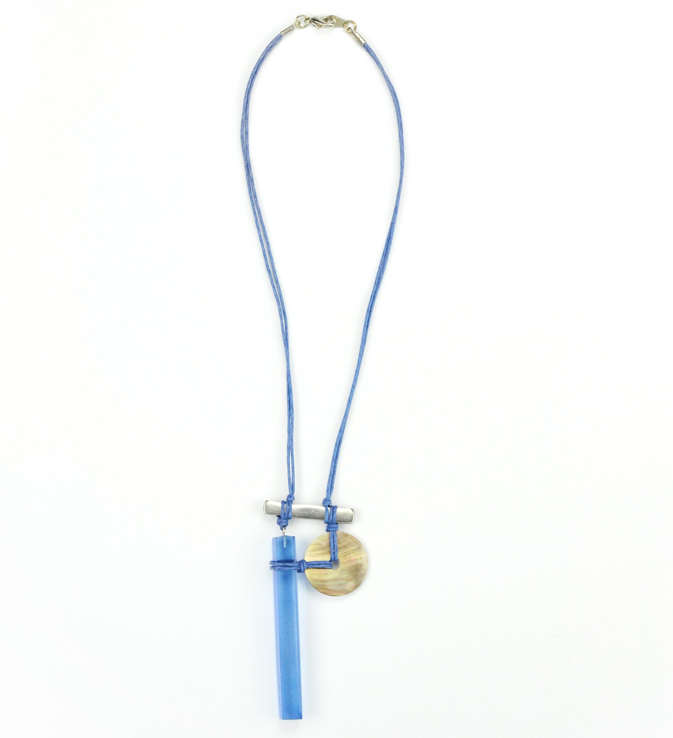 Composto por um delicado cordão azul acetinado, possui dois pendentes contrastantes que se complementam harmoniosamente: um tubo de acrílico azul translúcido e um disco de madrepérola com reflexos dourados e nacarados. Ambas as peças estão suspensas de uma barra horizontal metálica, que reforça a estética moderna da peça.