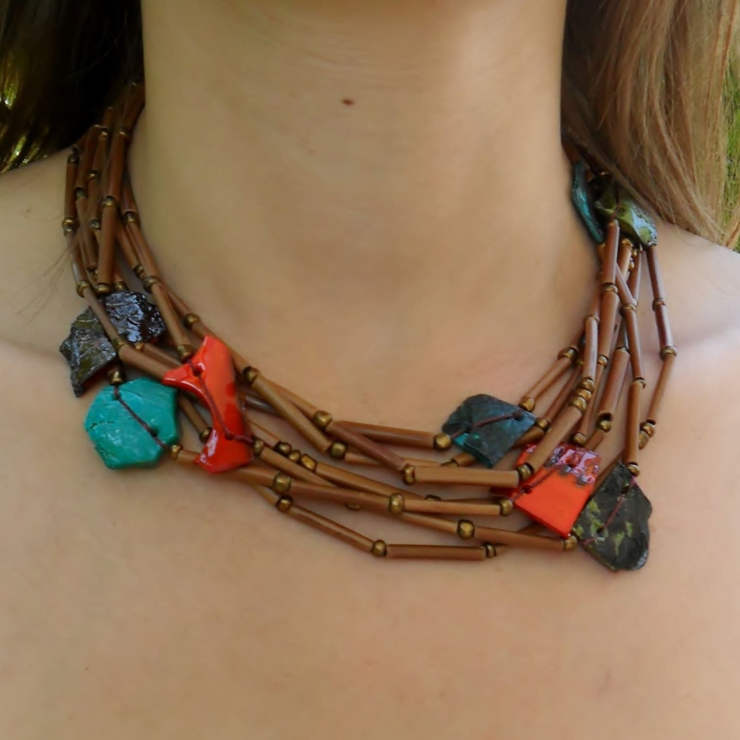 Colar curto com 7 voltas ornamentado com pequenos tubos de bamboo, peças em madrepérola toscas e missanga.