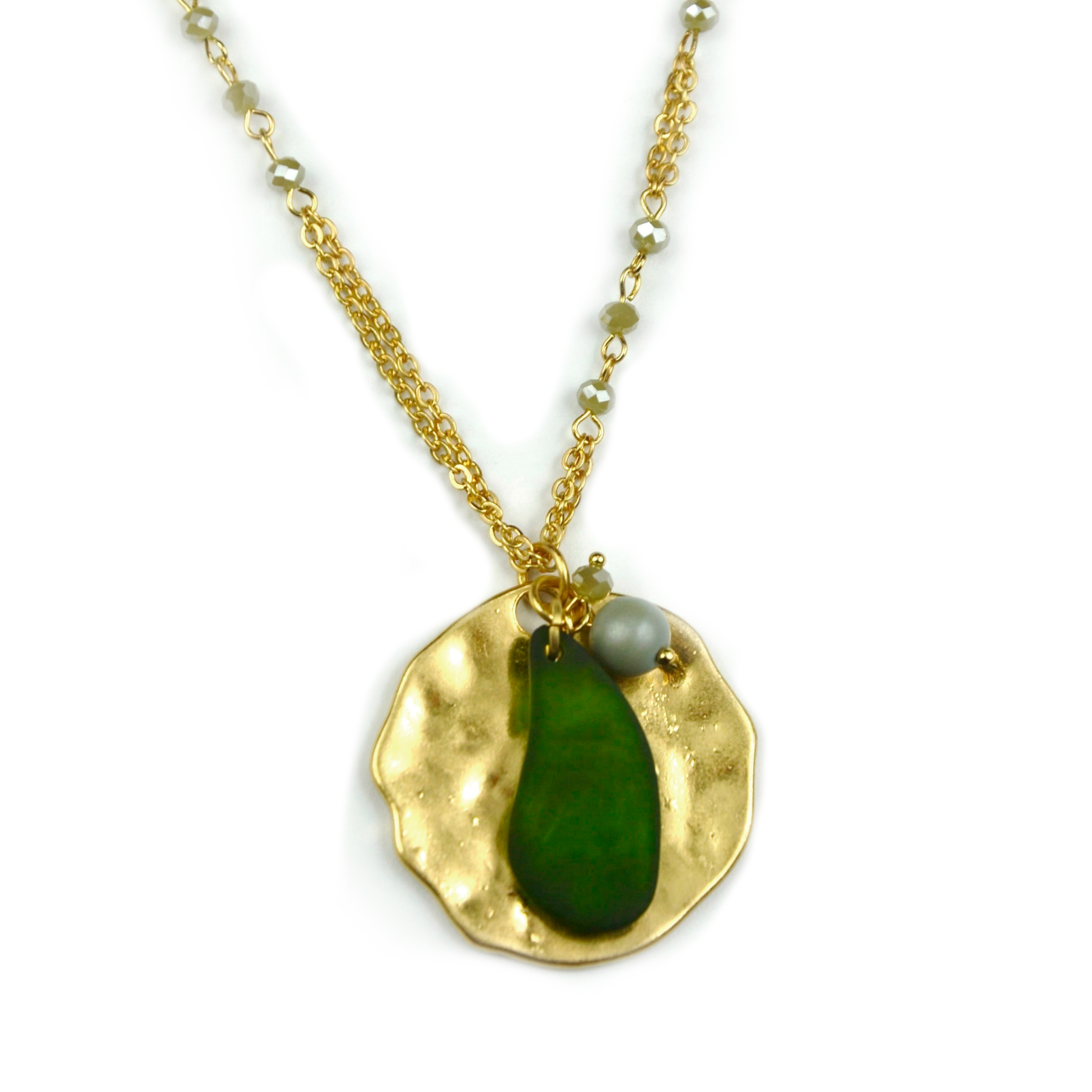 Colar comprido com pedras em resina, ajustável.