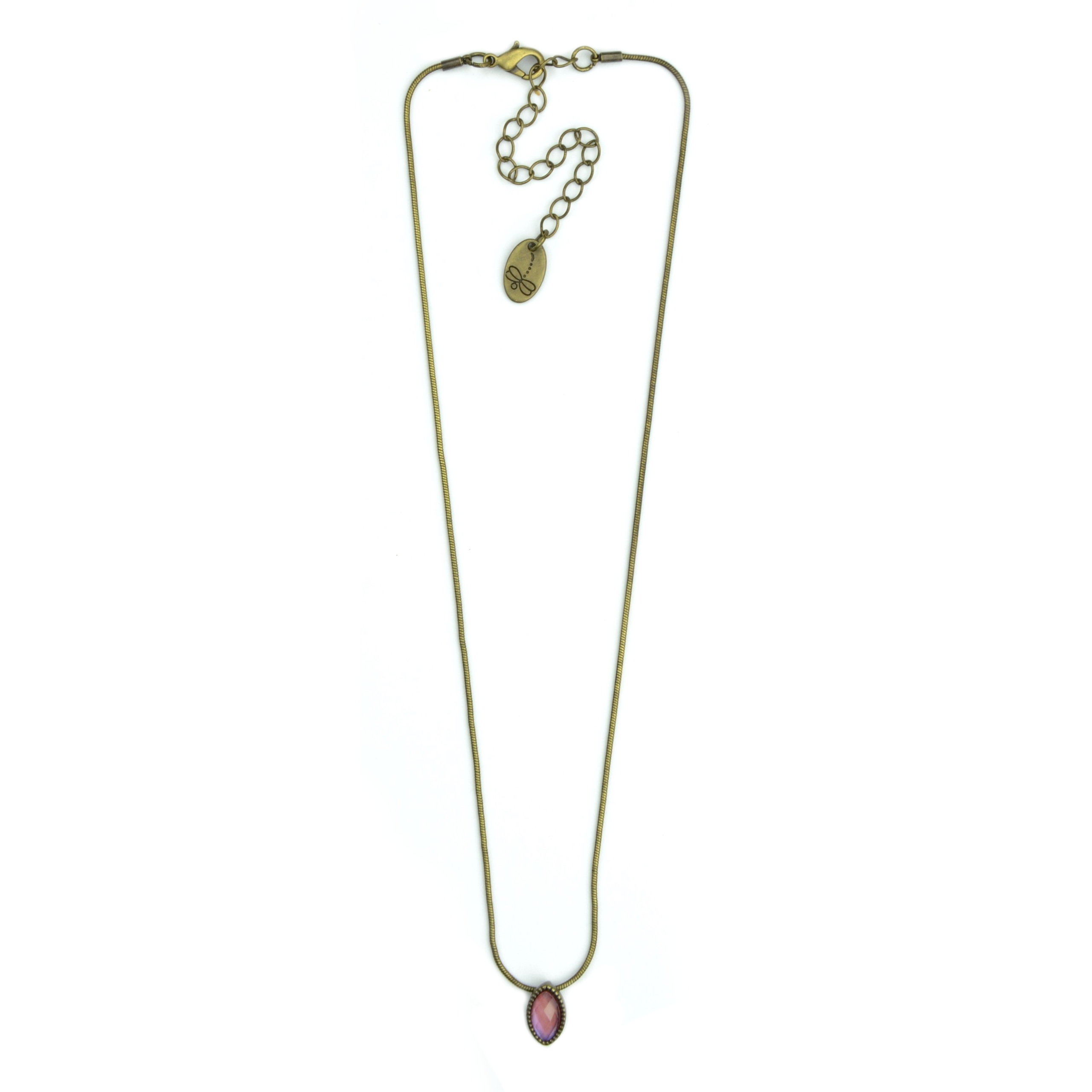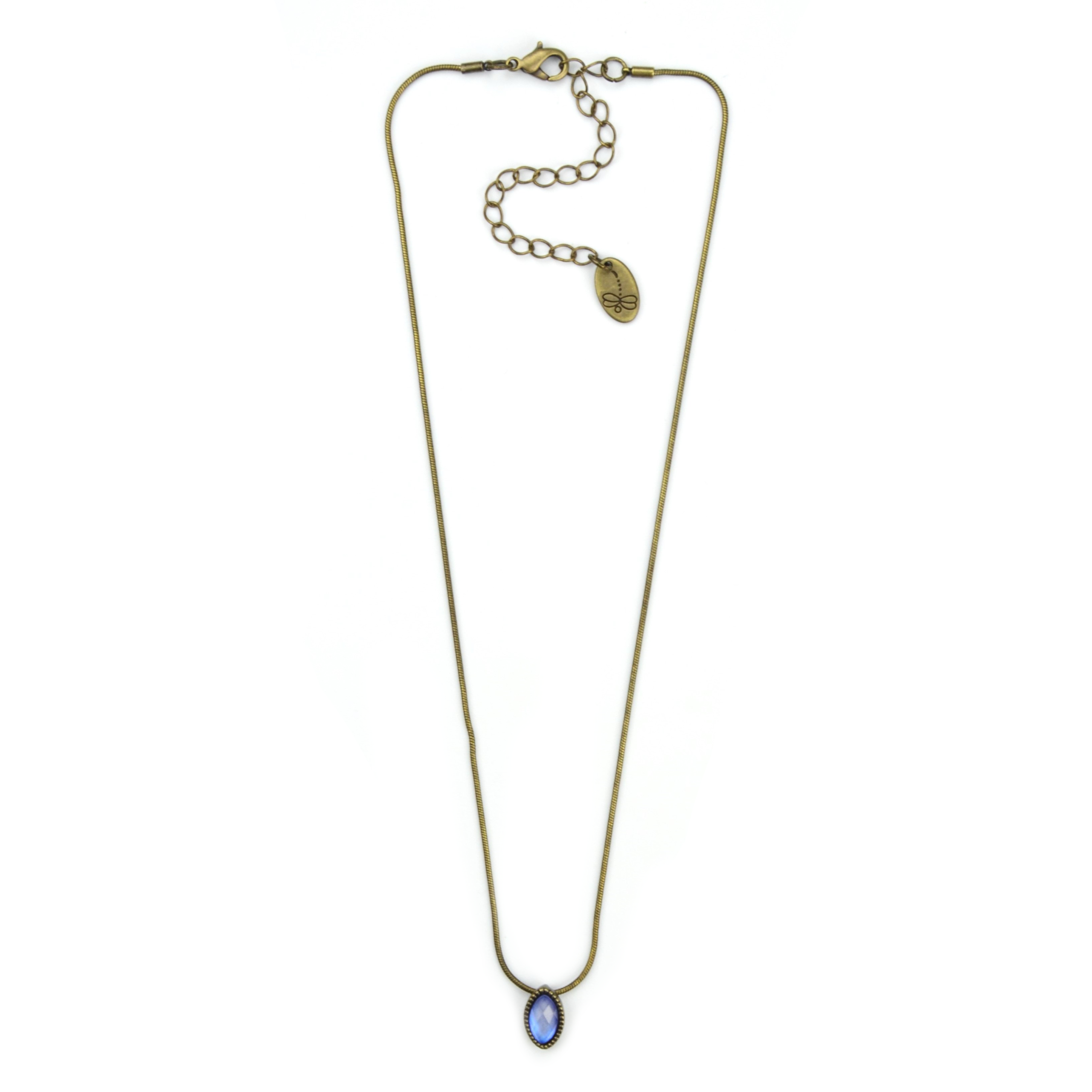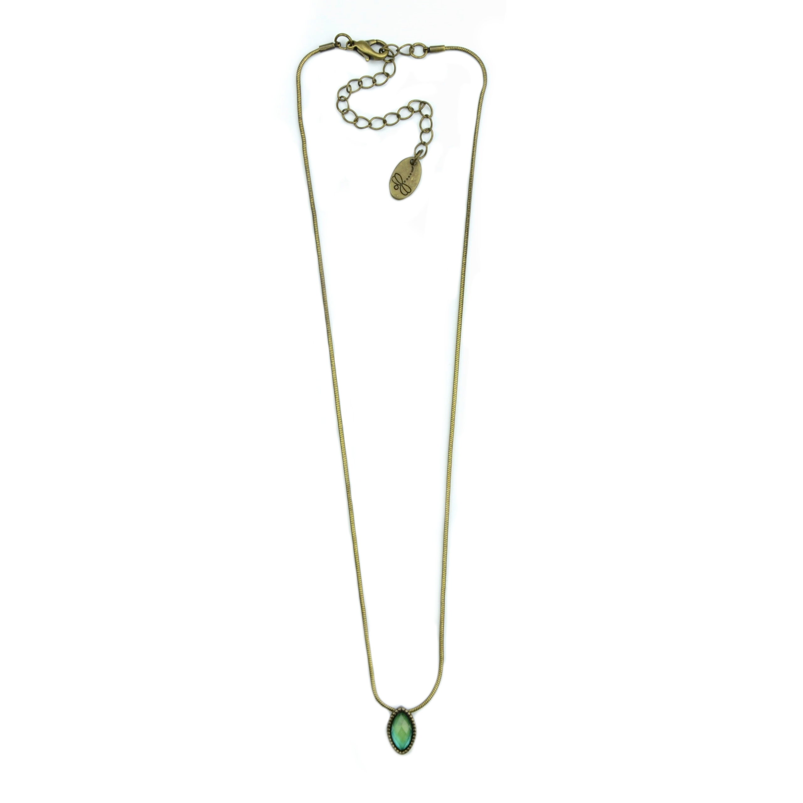 Colar “Carol” em metal dourado velho com lágrima pendente em acrílico colorido. O colar é curto com fecho de mosquetão com terminal ajustável.
