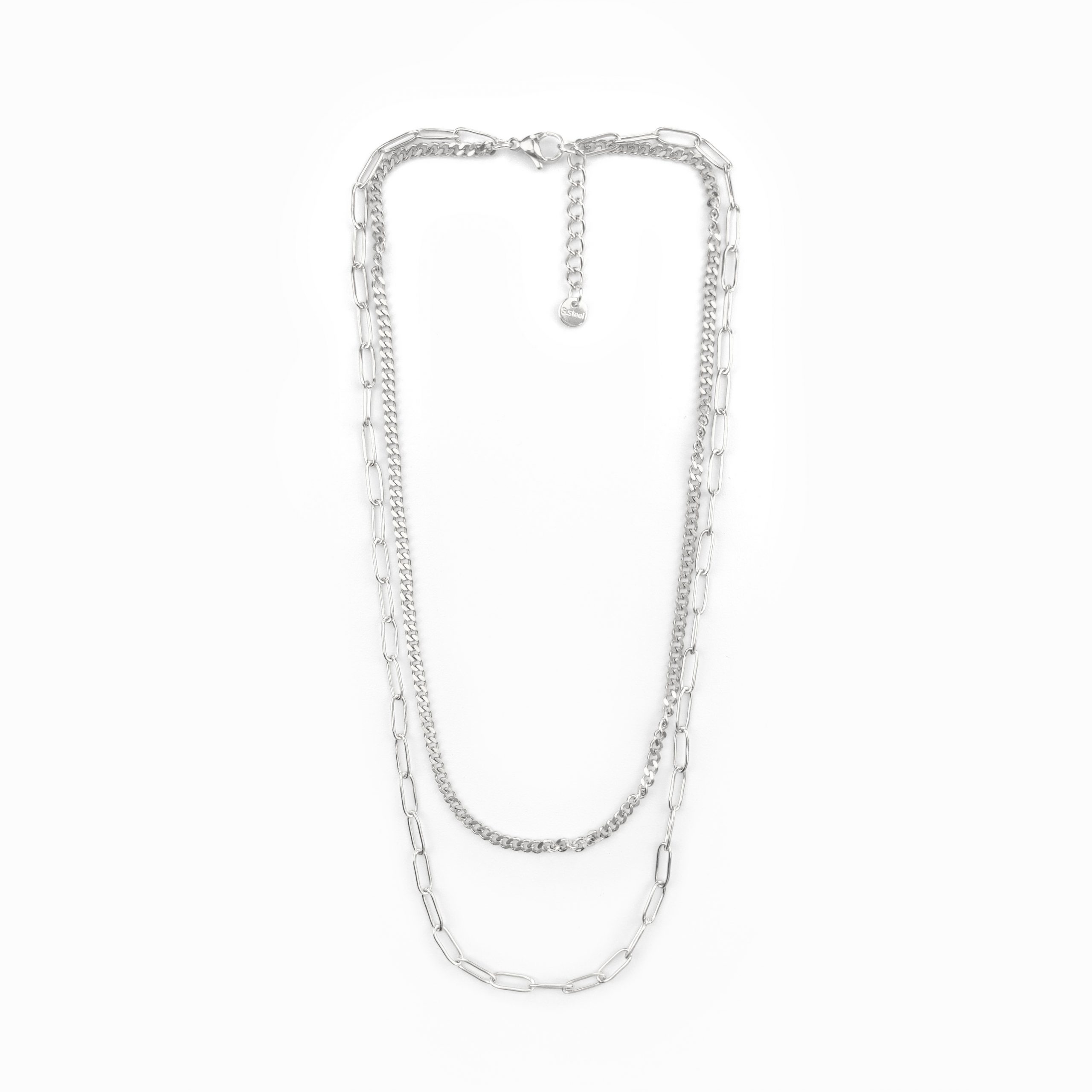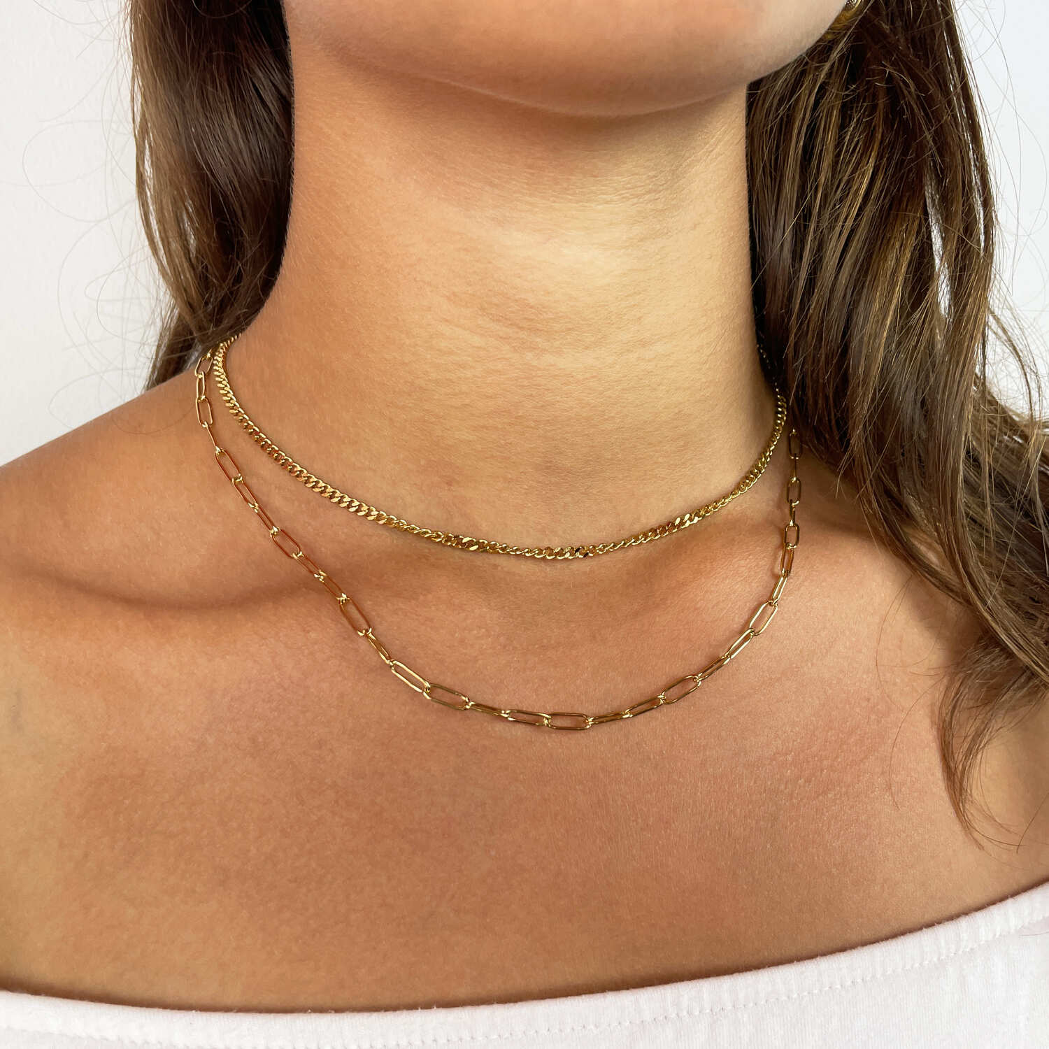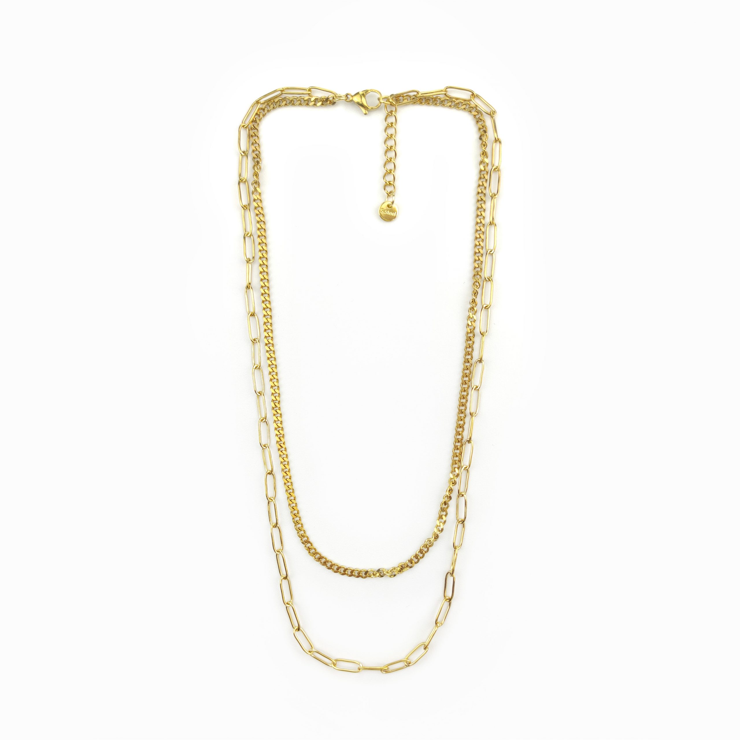 O colar apresenta 2 correntes diferentes uma com 15cm e outra com 17cm.