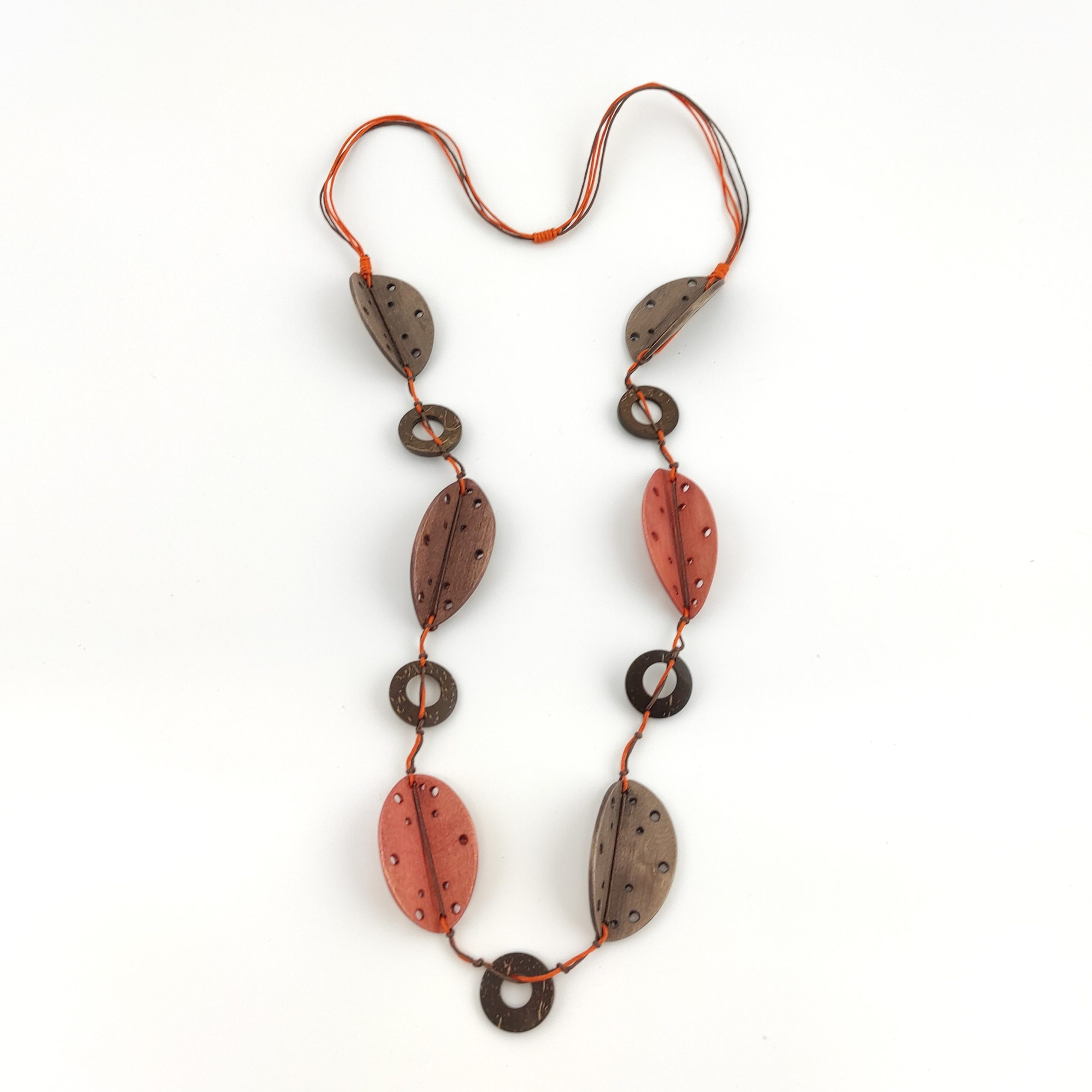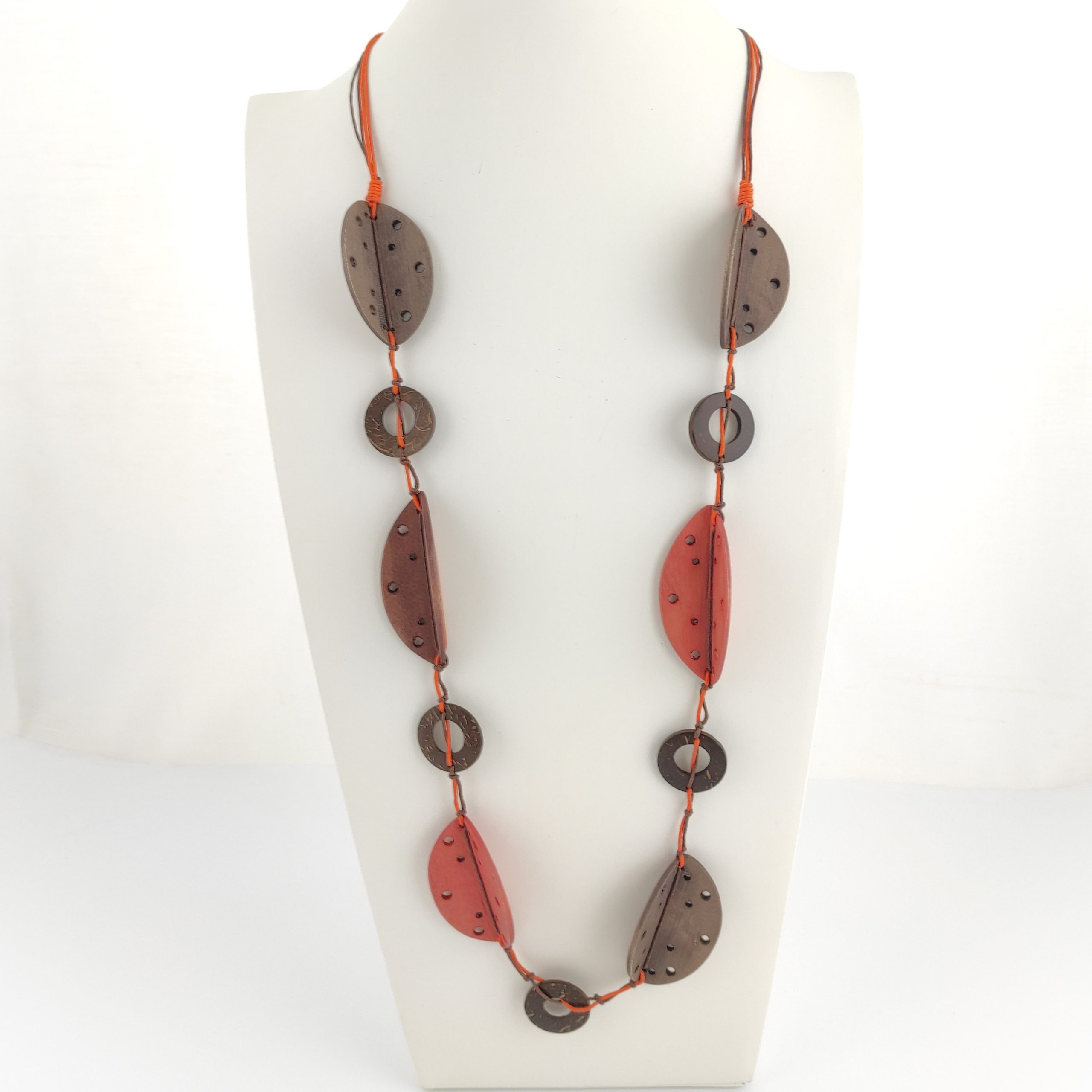 Colar leve feito de côco em tons de castanho e laranja. Indicado para o verão, embora, adequado a qualquer estação do ano.