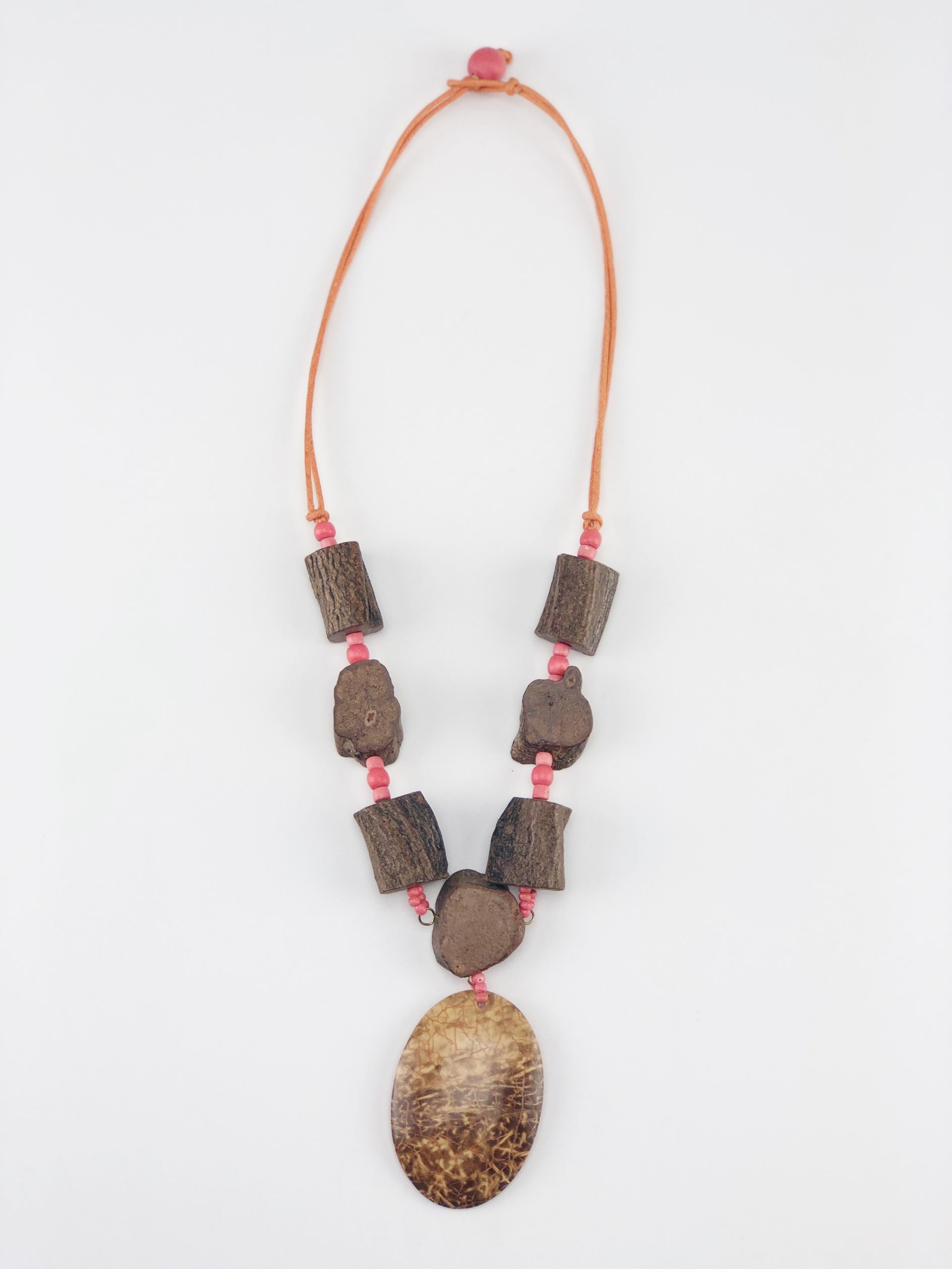 Colar com fio duplo em nylon, missanga e aplicações feitas em madeira envernizada.
