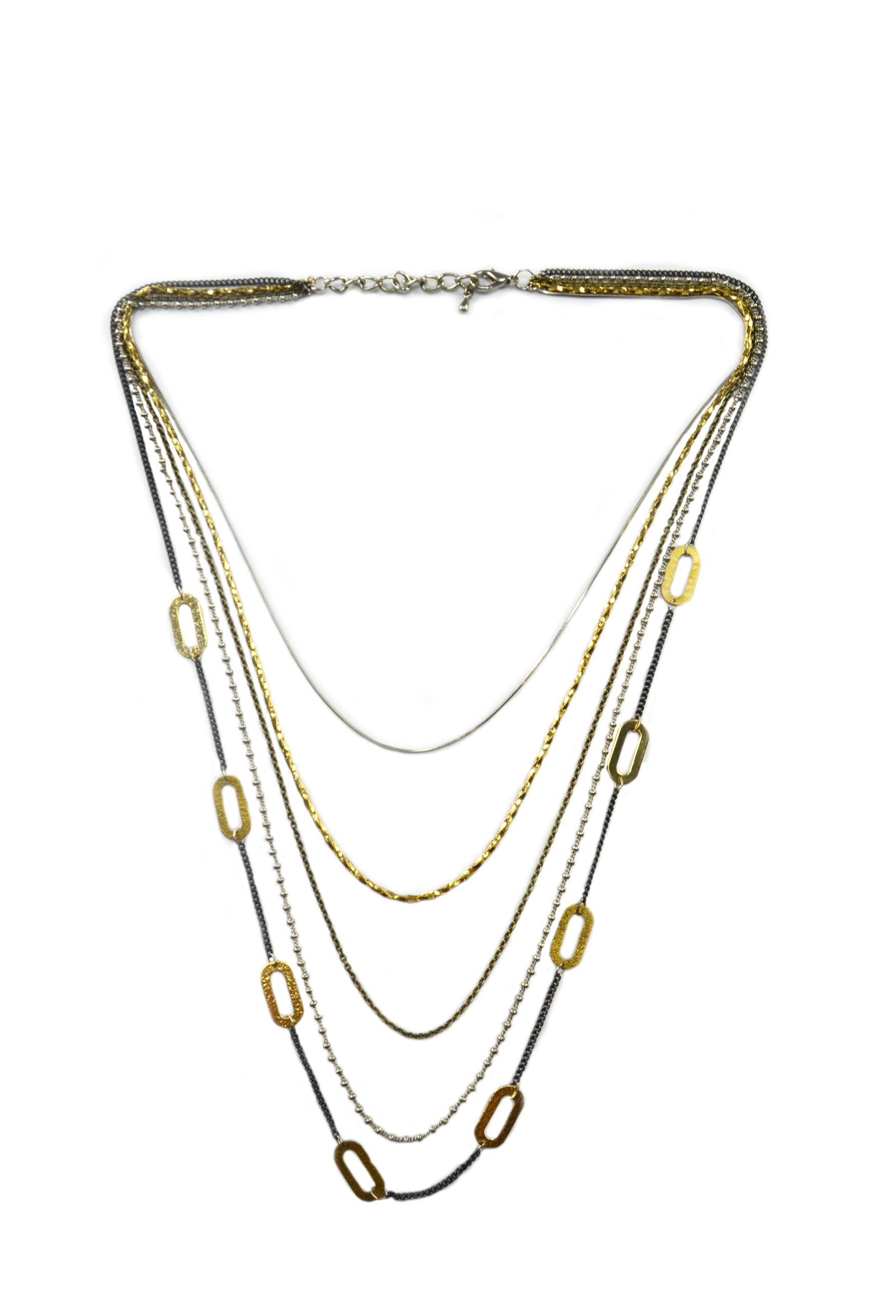 Colar comprido em metal em tons de dourado e prateado. Possui 5 voltas com correntes variadas. O fecho deste colar é de mosquetão com terminal regulável.