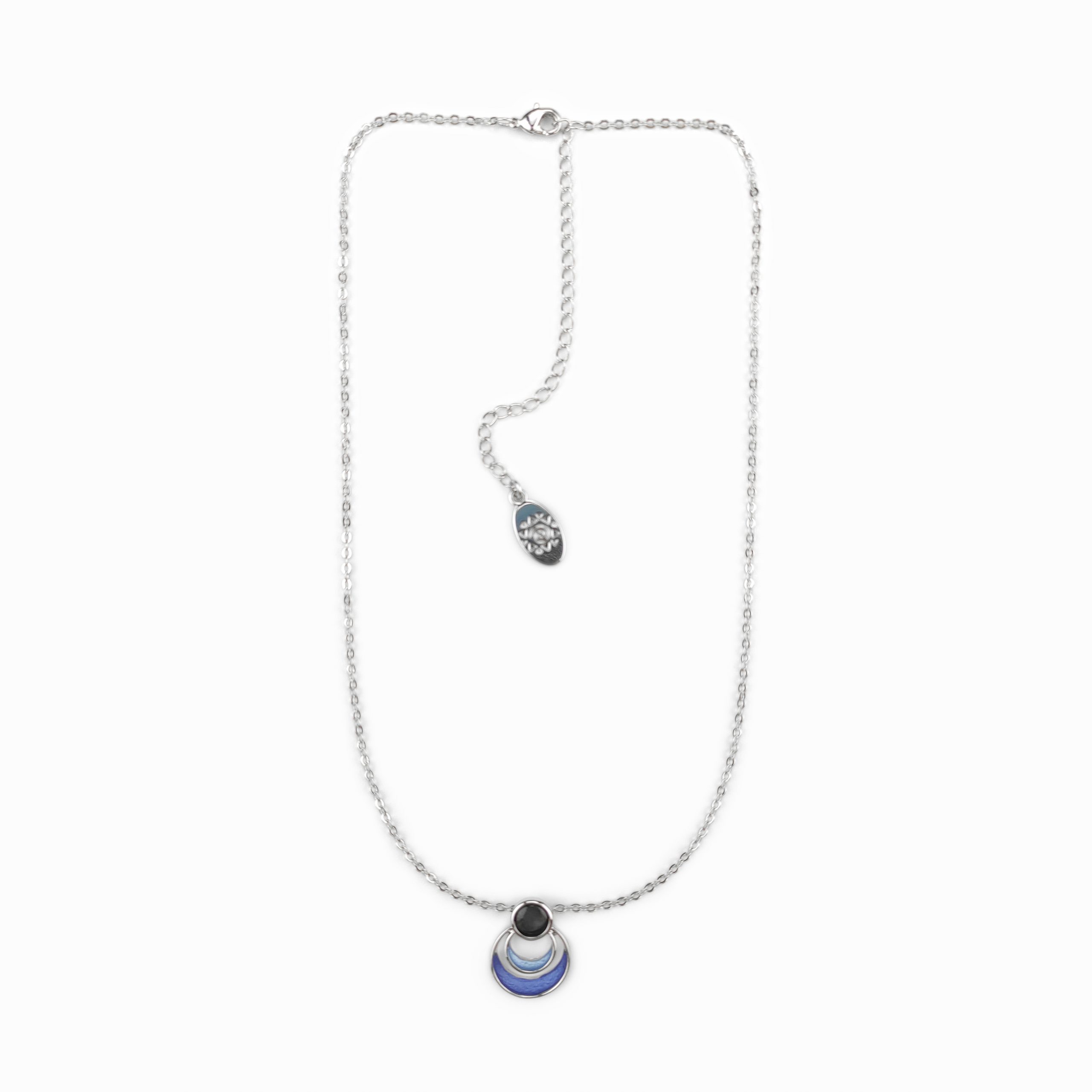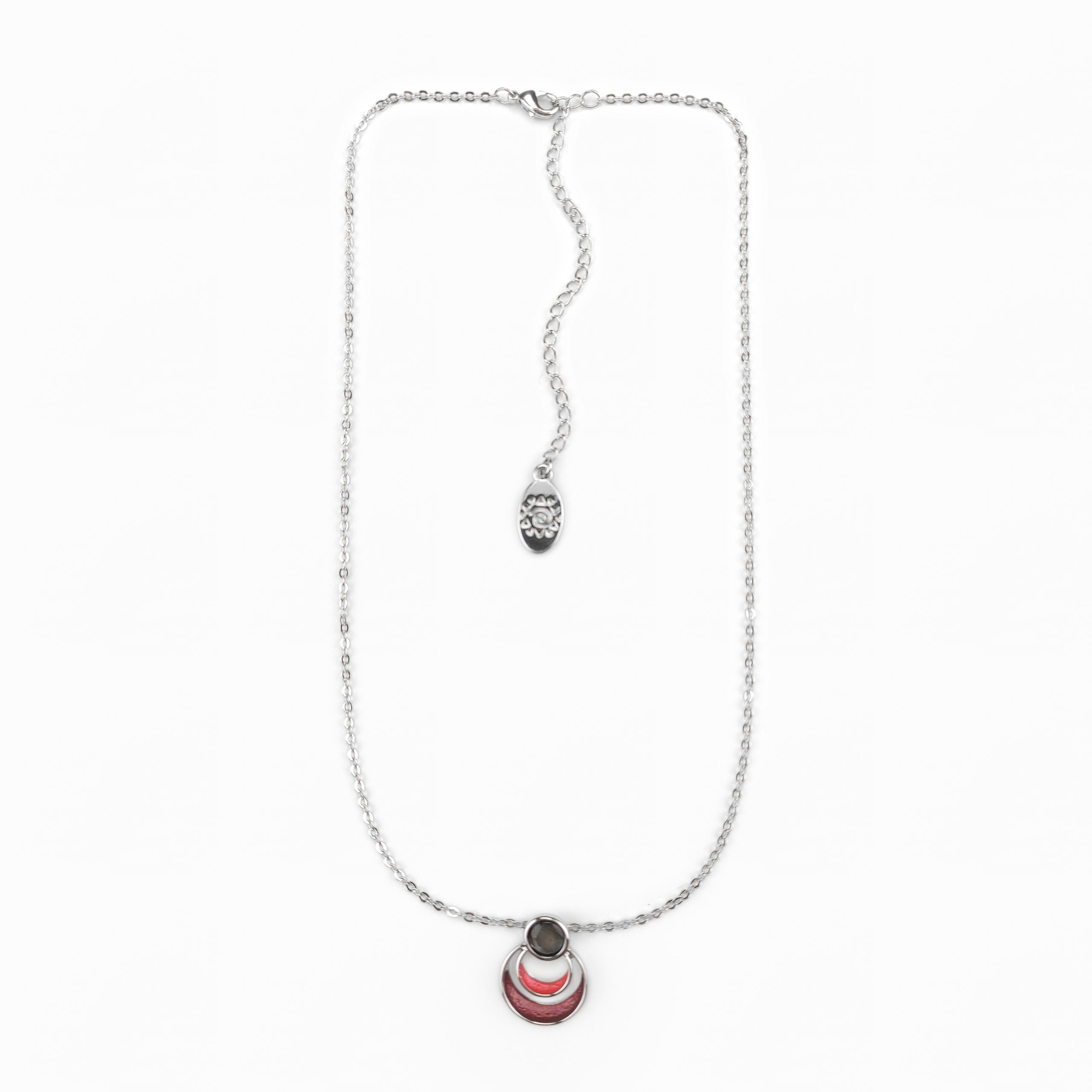 Colar curto em metal prateado com pendente em madrepérola e argolas pintadas à mão.