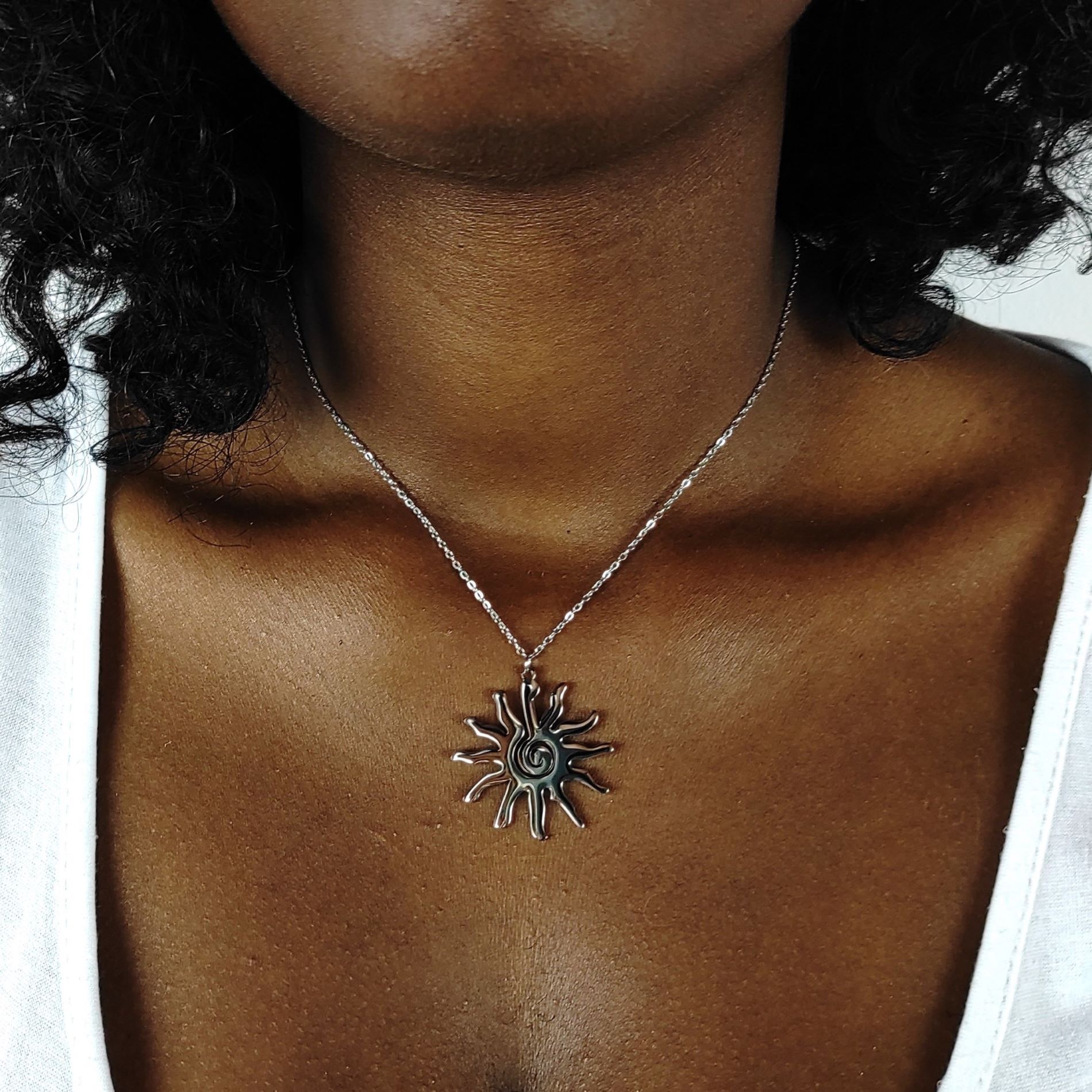 Colar curto prateado com pendente em forma de sol.