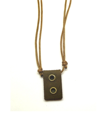 O elemento central é um pendente retangular em pele, que confere um carácter robusto e orgânico à peça.