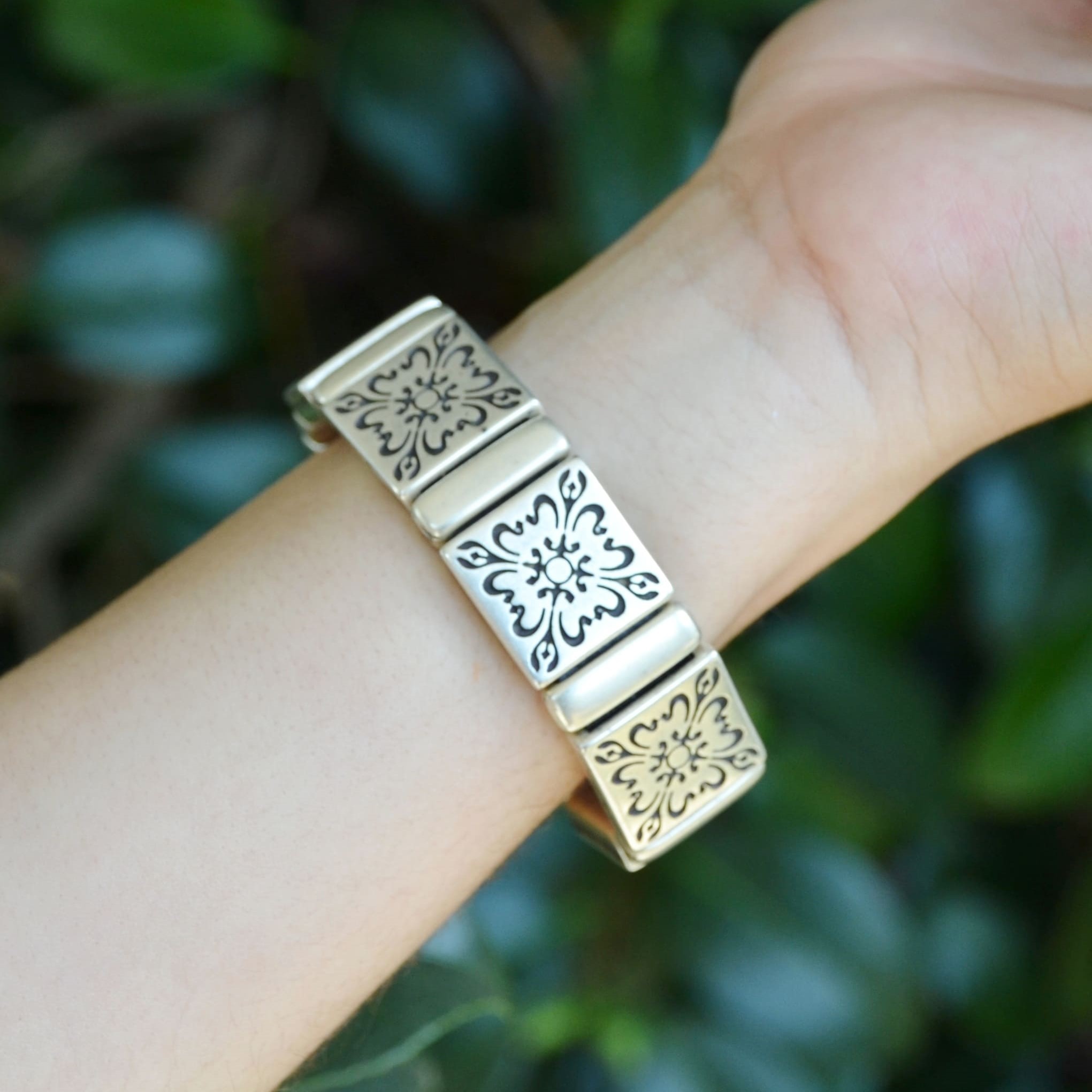 Pulseira de couro revestida a peças de alpaca com banho de prata trabalhadas com símbolos tribais.
