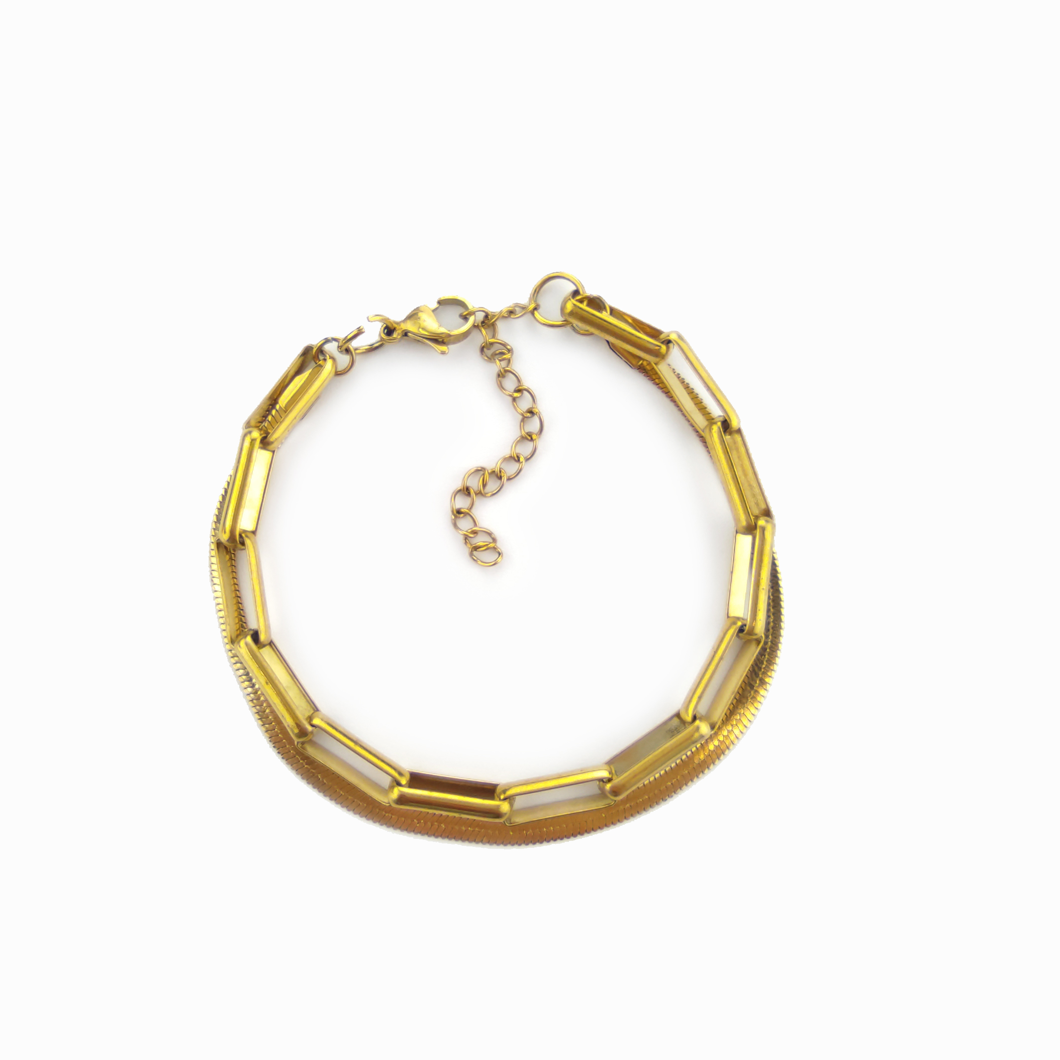 Pulseira em aço com dupla corrente, uma com elos retangulares e outra com malha de serpente.